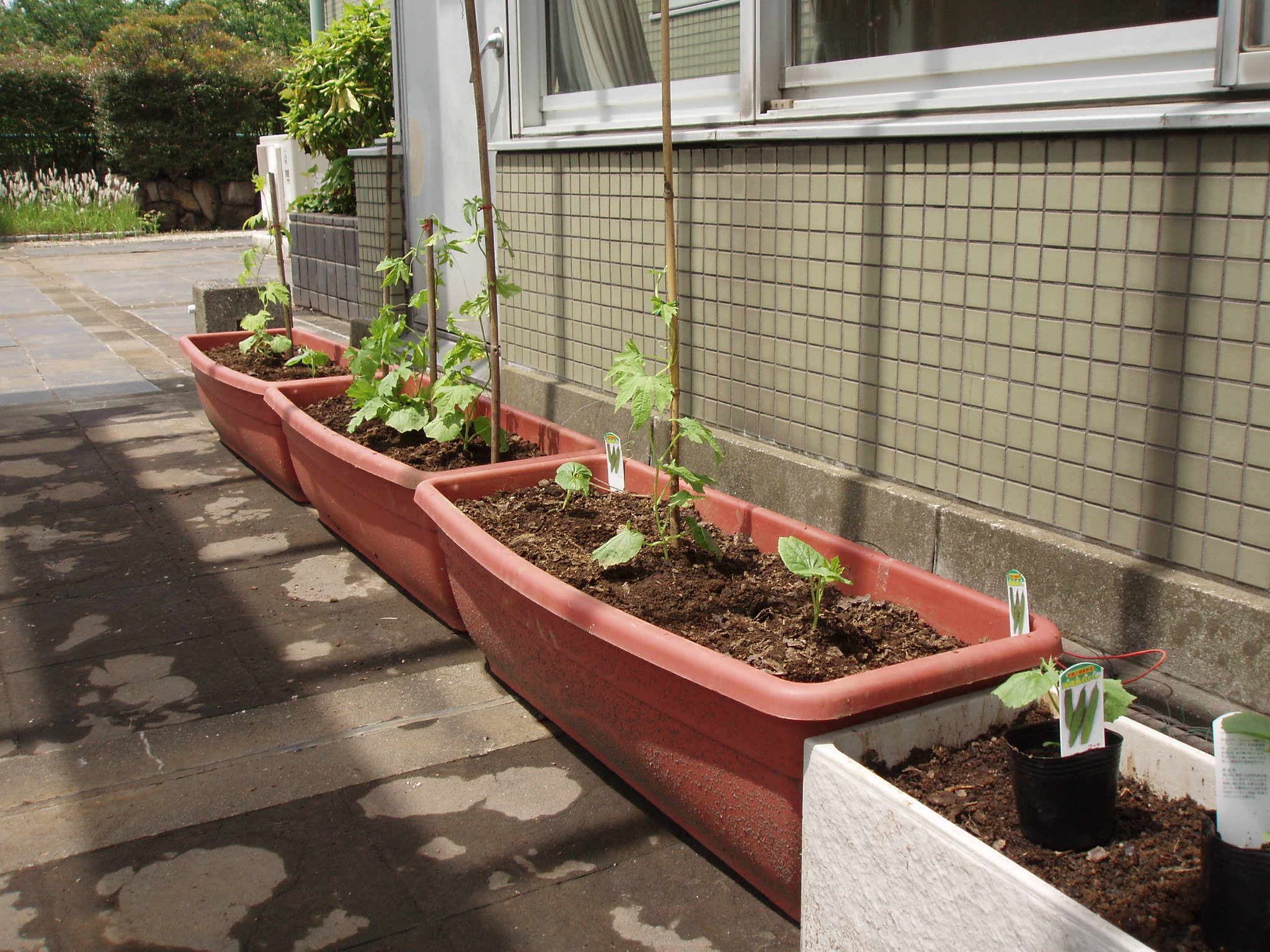 今日は、ゴーヤの苗がボランティア(囲碁同好会)の方の手で植えられました。