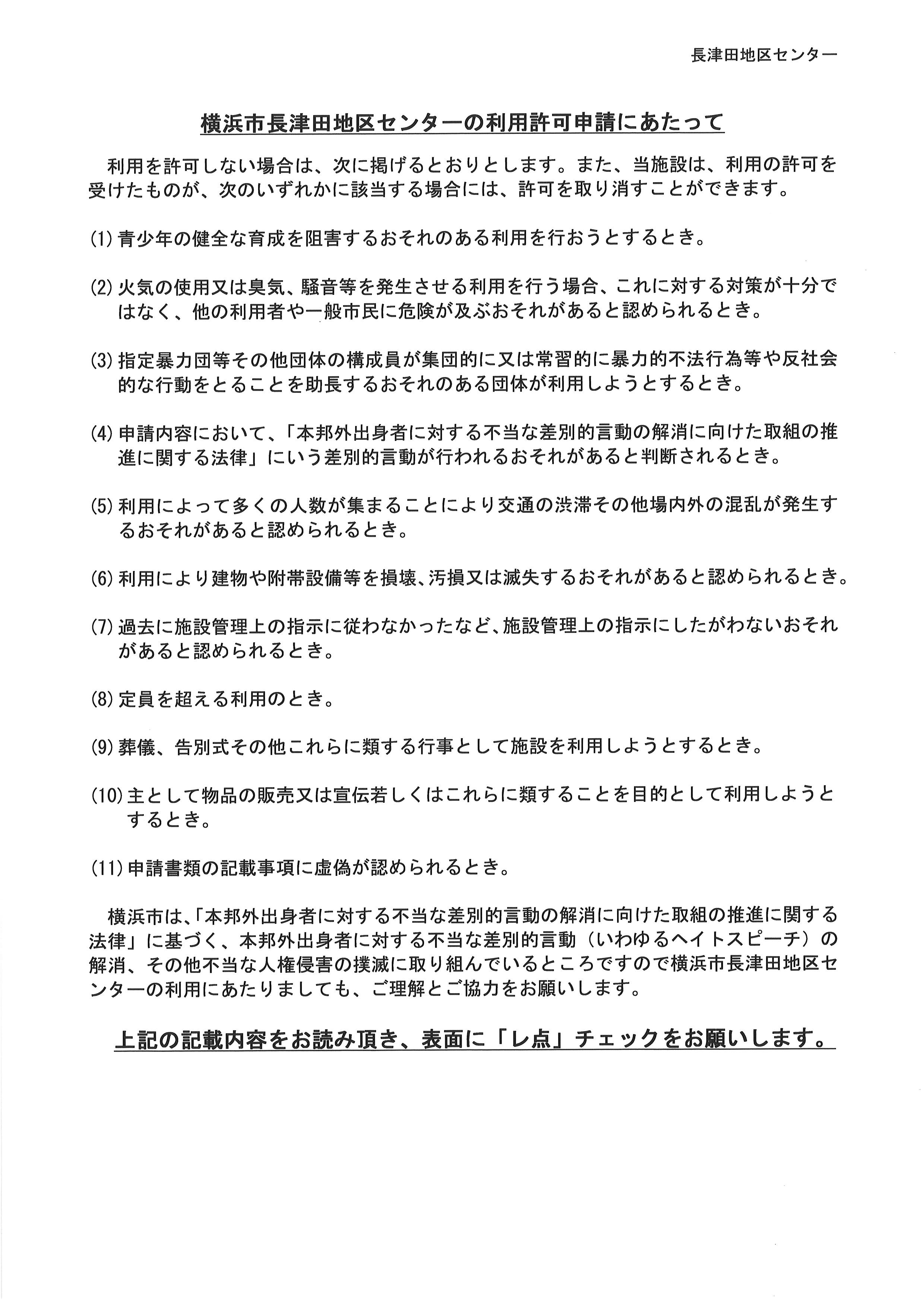 従いまして、当館ではご利用前にお渡しております団体利用報告書の裏面に記載しております「利用許可申請にあたって」をご利用の都度、事前にご確認頂いた上で、当日責任者の方のご署名、及び、項目チェック欄へ「レ点チェック」頂けます様お願い致します。