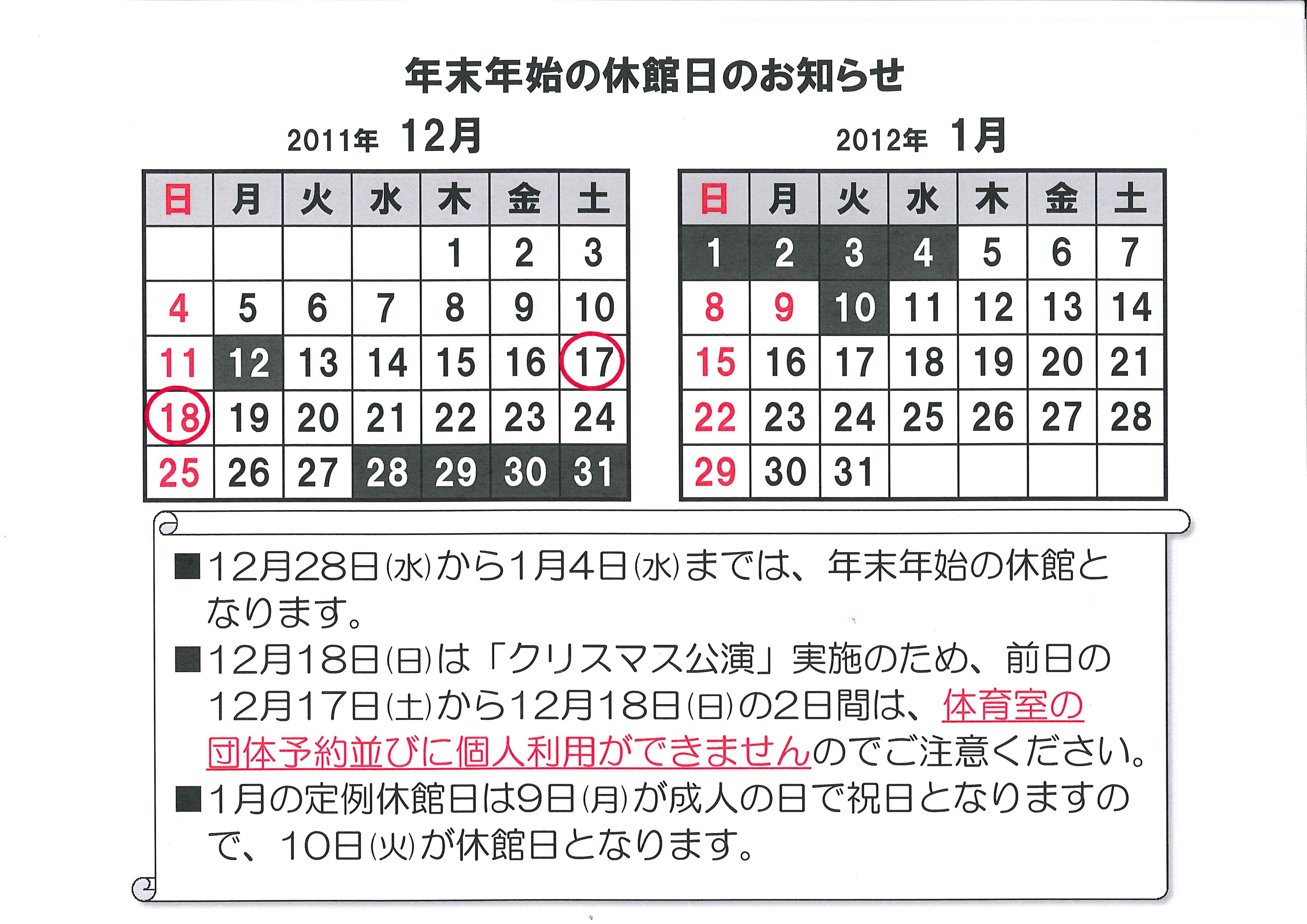 12月・1月の休館日