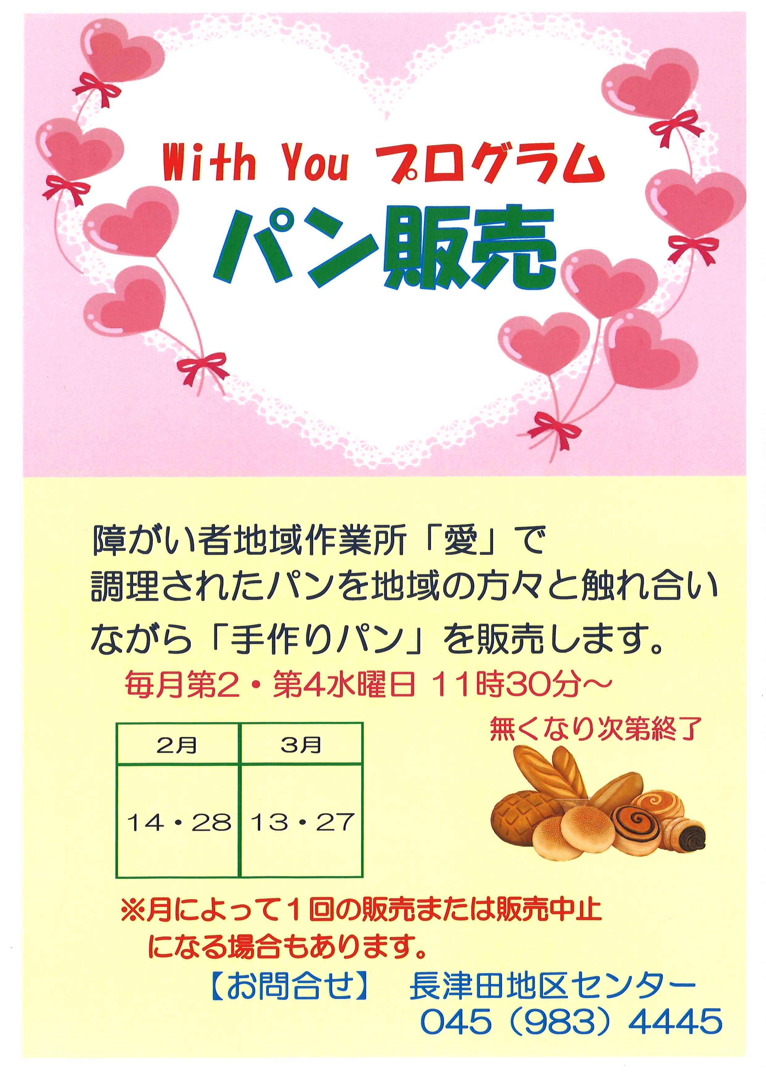 当館では with You プログラムとして、障がい者地域作業所「愛」で調理されたパンを地域の方々と触れ合いながら「手作りパン」を販売しております。