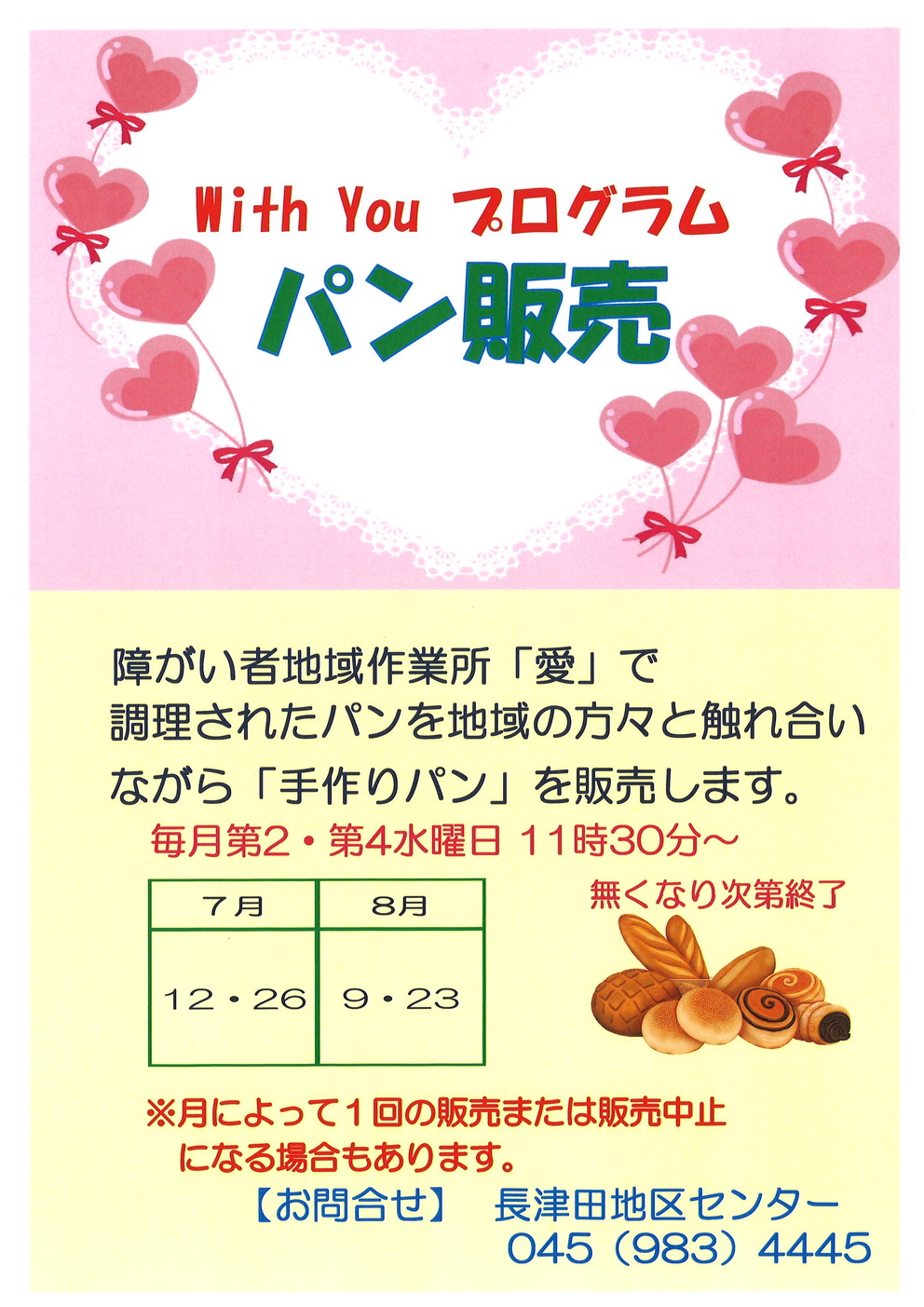 当館では with You プログラムとして、障がい者地域作業所「愛」で調理されたパンを地域の方々と触れ合いながら「手作りパン」を販売しております。