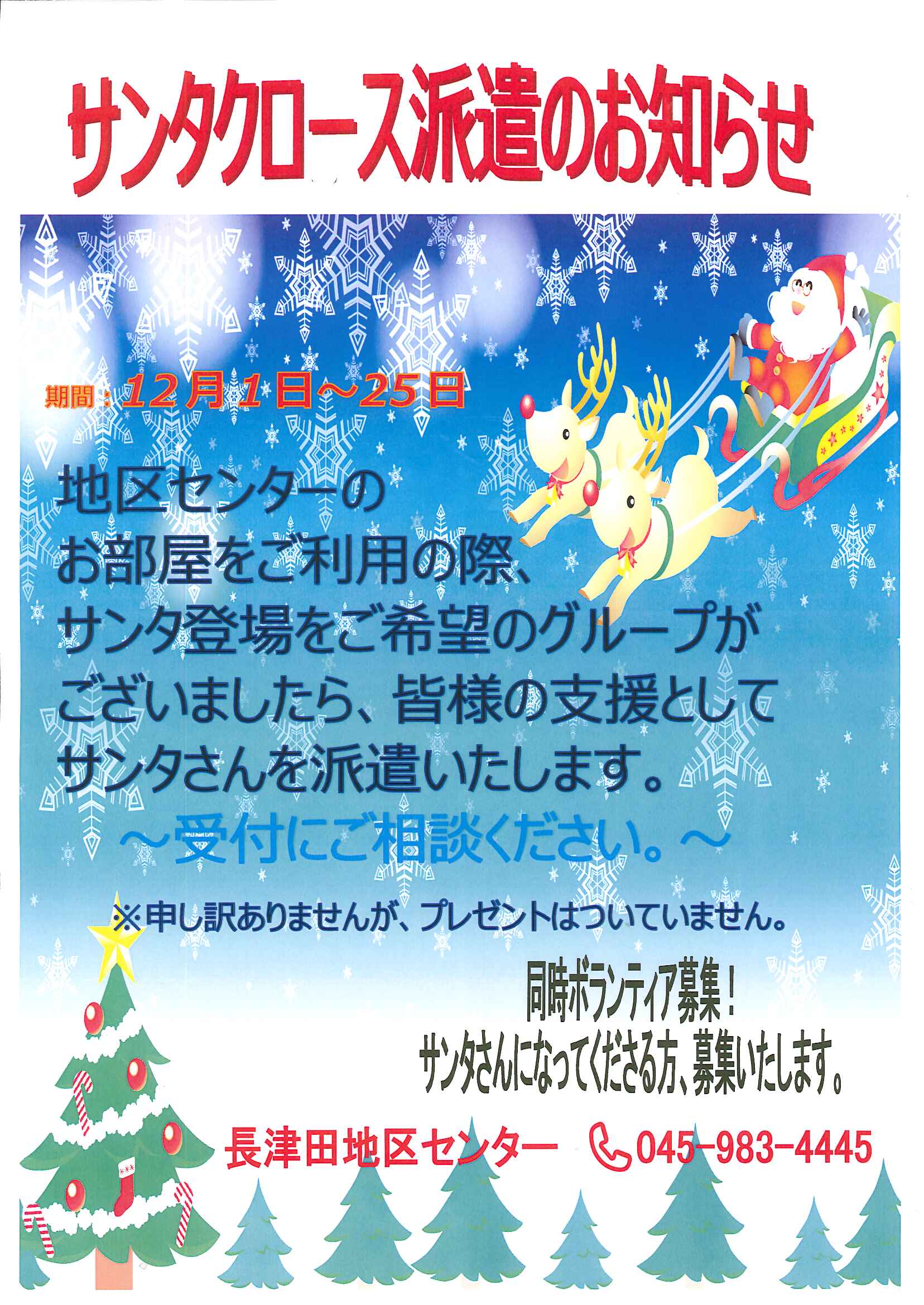 長津田地区センターでは恒例となりました『サンタさんの派遣』を今年も実施致します!