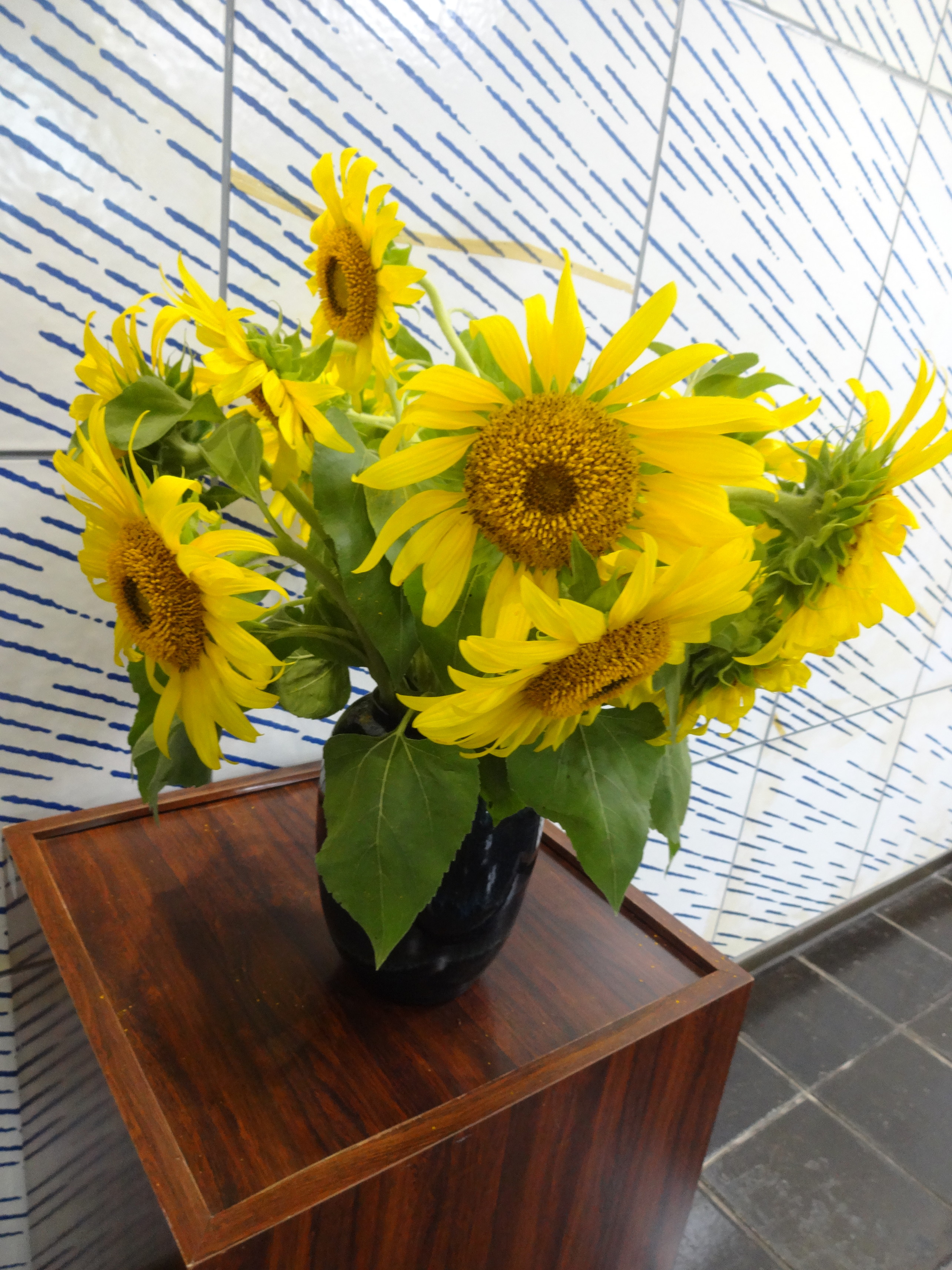 小学生お楽しみ教室「絵を描こう」のモチーフに使用したひまわりをホールに飾っています。