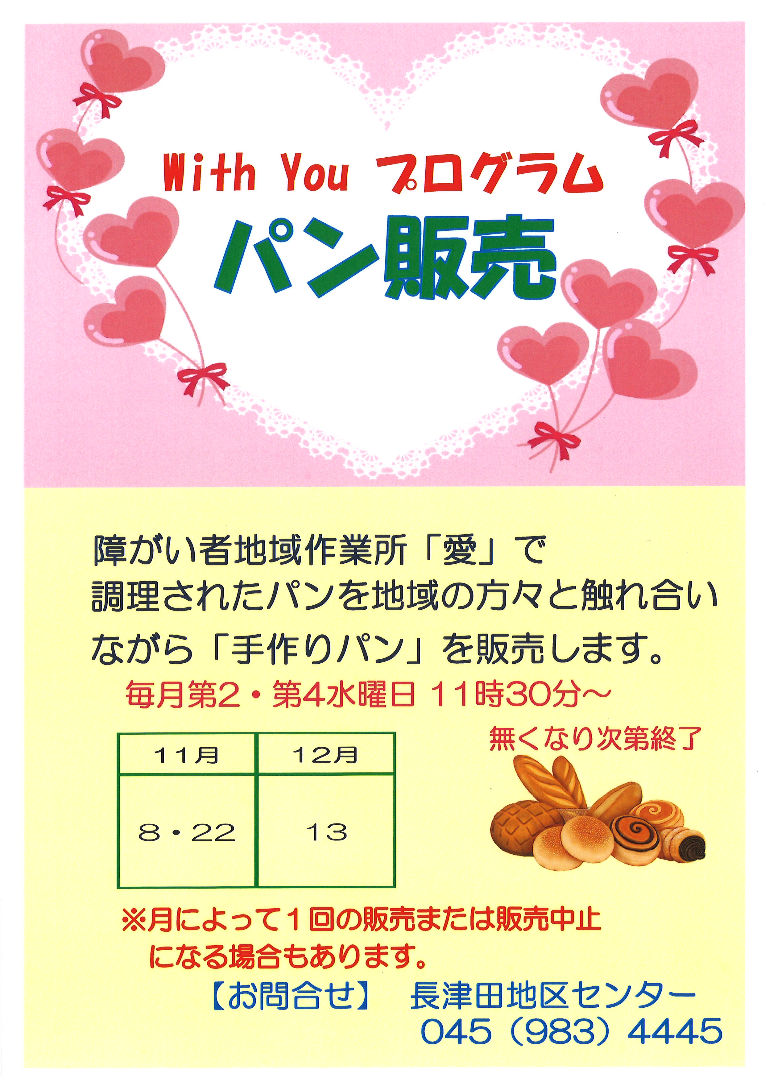 当館では with You プログラムとして、障がい者地域作業所「愛」で調理されたパンを地域の方々と触れ合いながら「手作りパン」を販売しております。