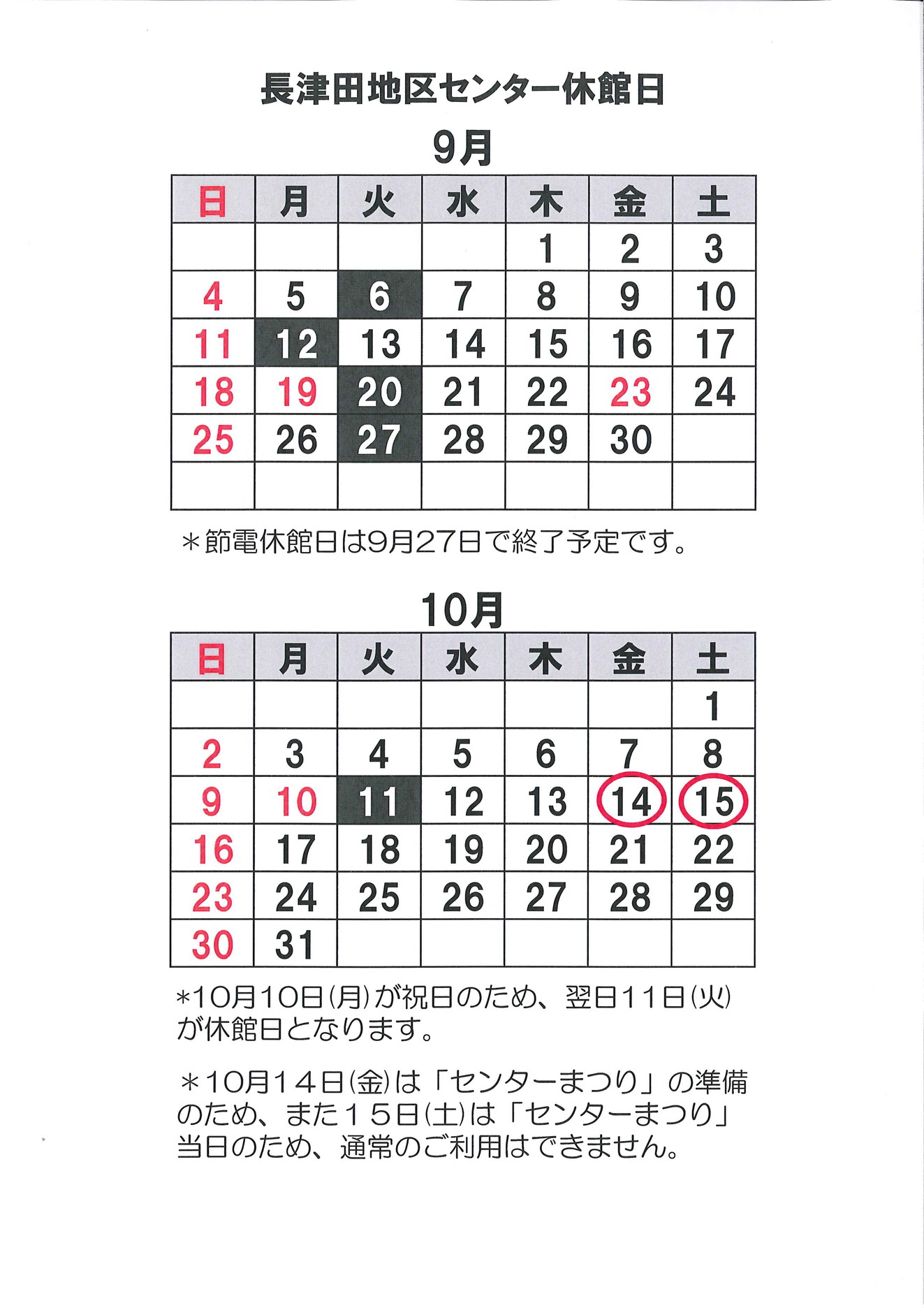なお、10月15日(土)は「センターまつり」を行いますので、当日と
