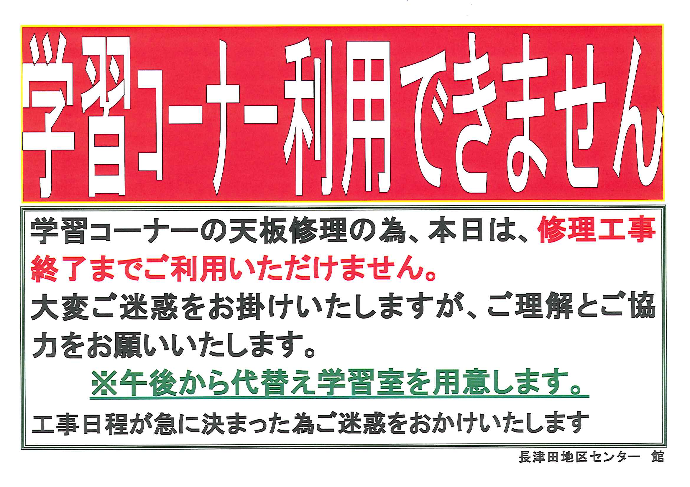 本日、学習コーナーの利用ができません
