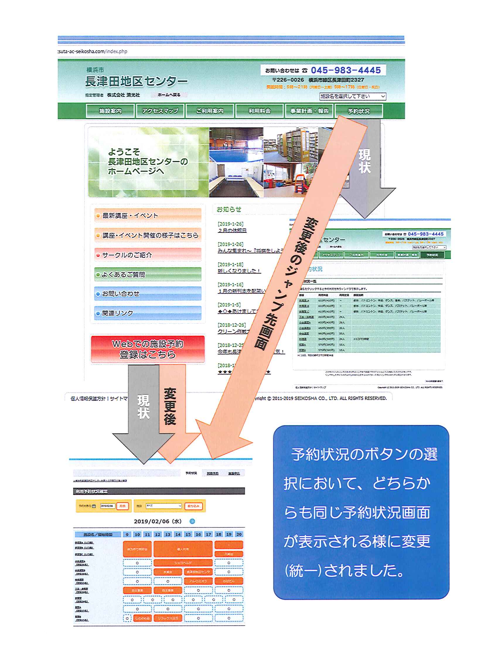 予約状況のボタンの選択において、どちらからも同じ予約状況画面が表示される様に変更(統一)されました。