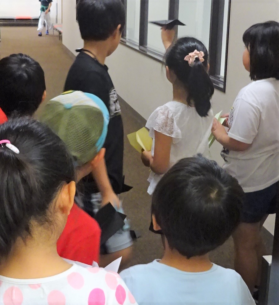 カラフルな色の紙で色々な形のひこうきを作って、みんなで飛ばして遊びました。