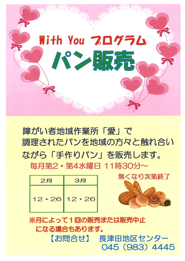当館では with You プログラムとして、障がい者地域作業所「愛」で調理されたパンを地域の方々と触れ合いながら「手作りパン」を販売しております。