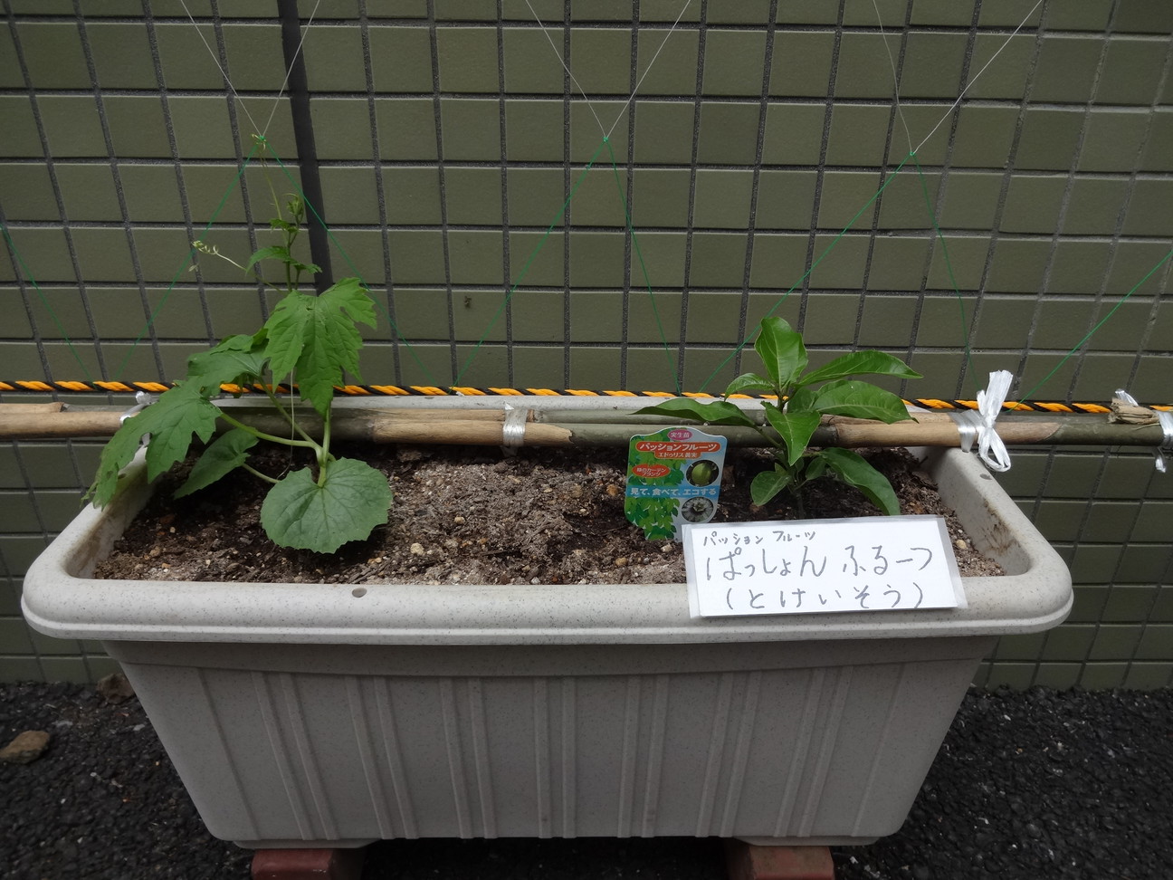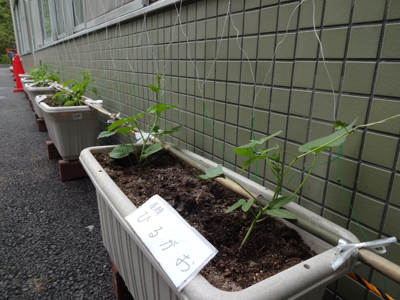 植栽ボランティアの方が、緑のカーテンを植えてくれました。今年のカーテンは、アサガオ(ヒルガオ科)、ヒルガオ(ヒルガオ科、ヒルガオ属)、ゴウヤ(ニガウリ、ウリ科)、パッションフルーツ(トケイソウ科)です。