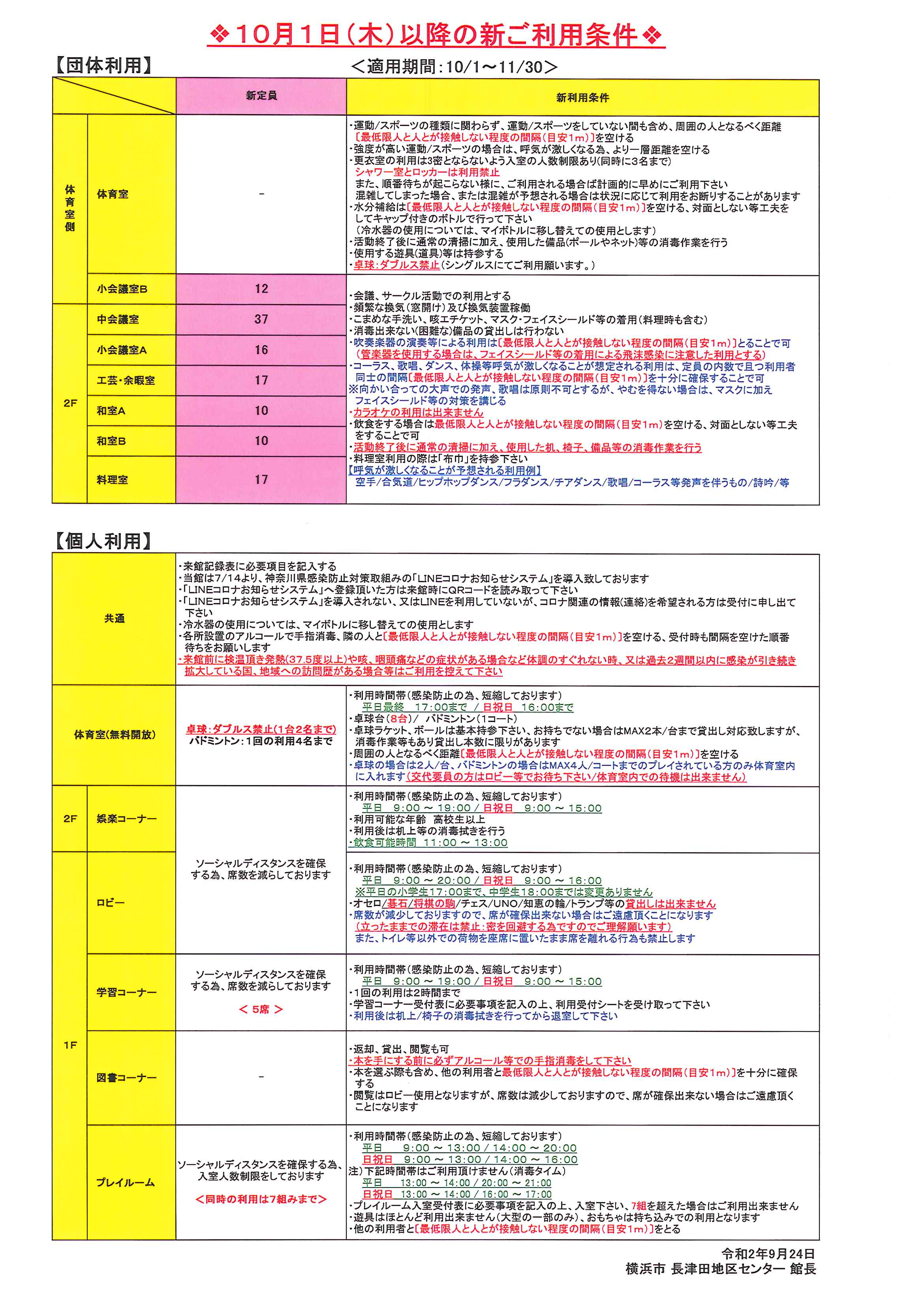 この度、10月1日以降〔11月30日まで〕における横浜市での利用制限等に係る取り扱い方針が決定されました。
