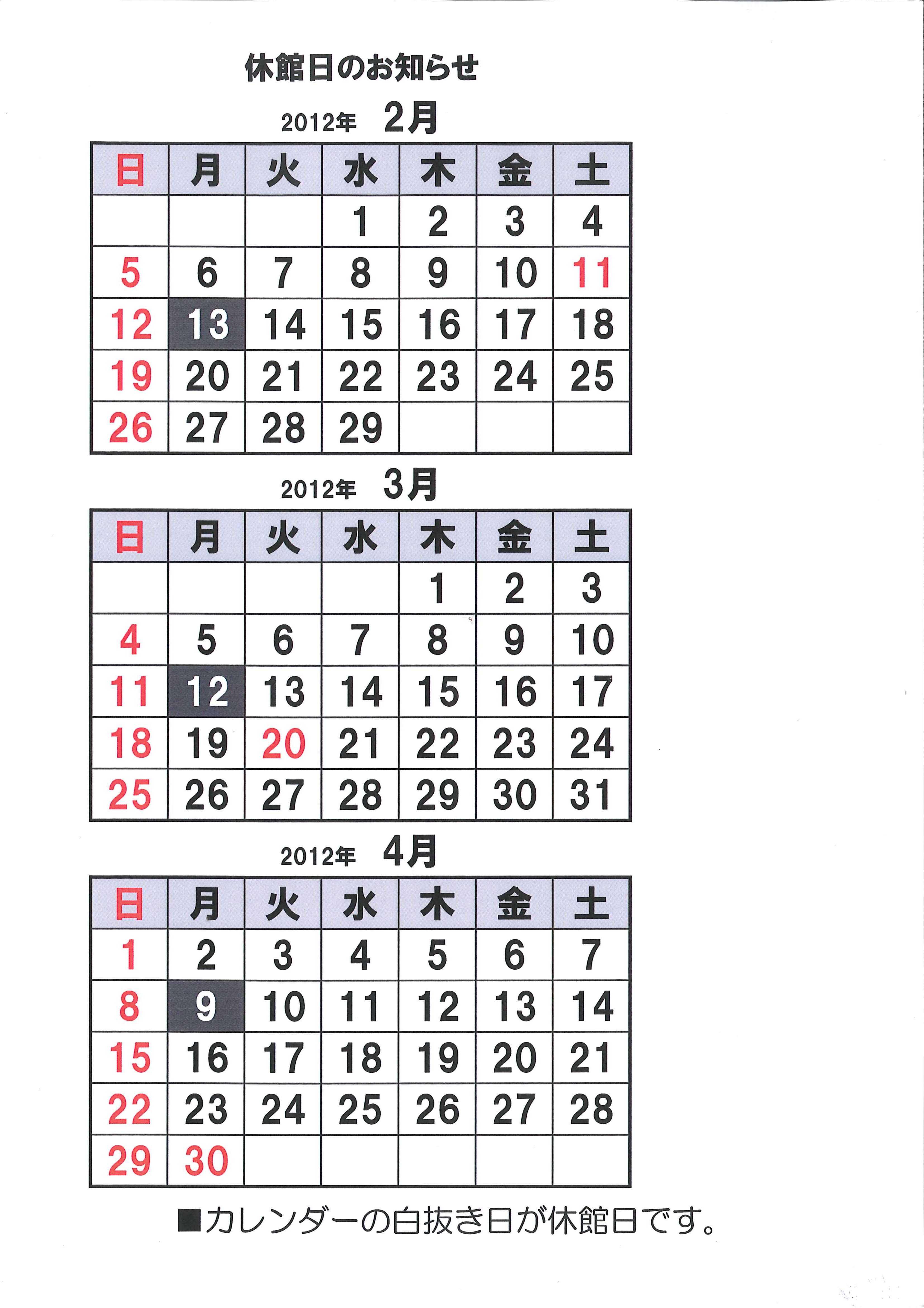 2月から4月の休館日をお知らせいたします。