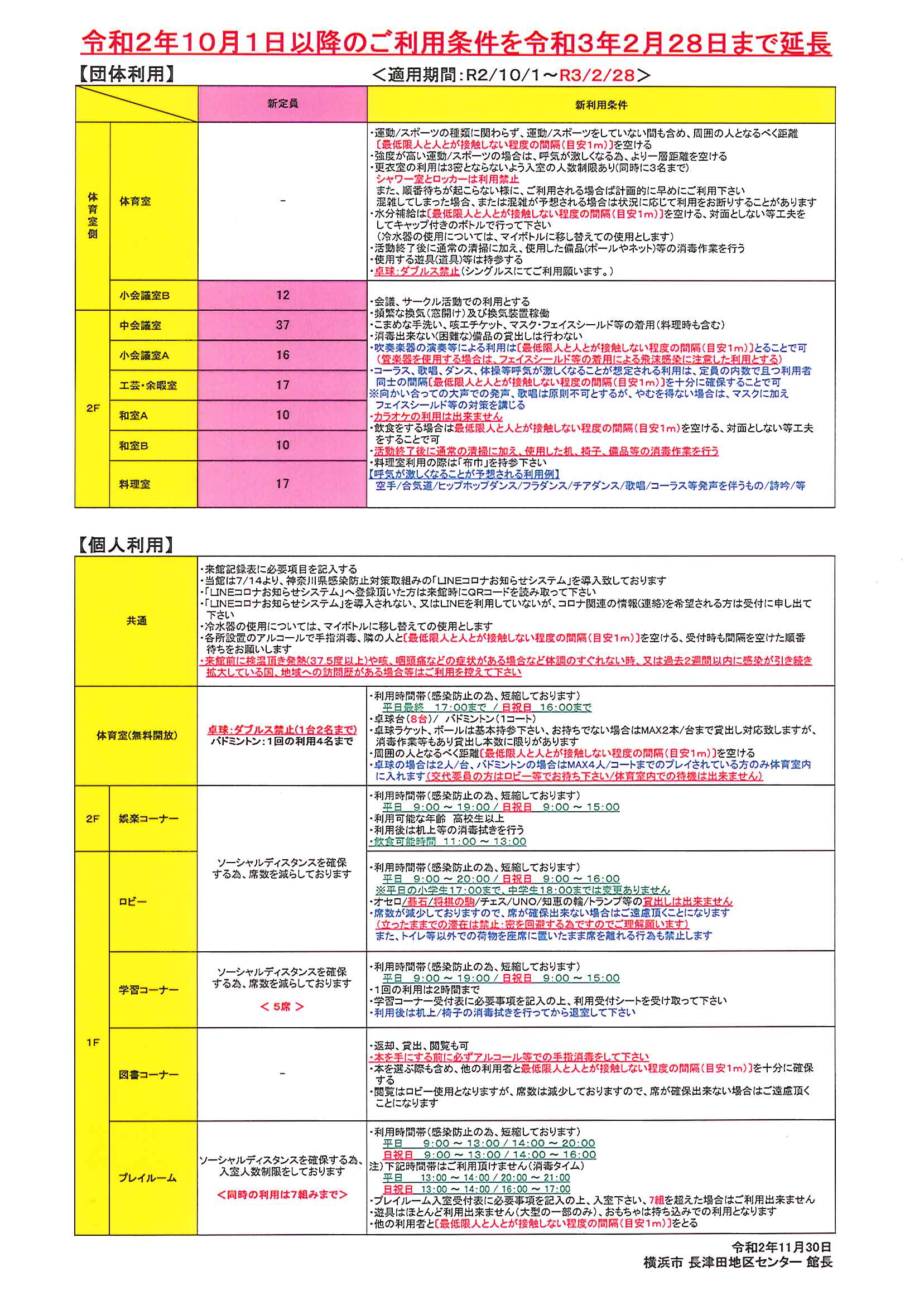 この度、12月1日以降〔令和3年2月28日まで〕における横浜市での利用制限等に係る取り扱い方針が決定されました。令和2年10月1日より適用しております『現行の利用制限を令和3年2月28日まで延長』することとなりました。
