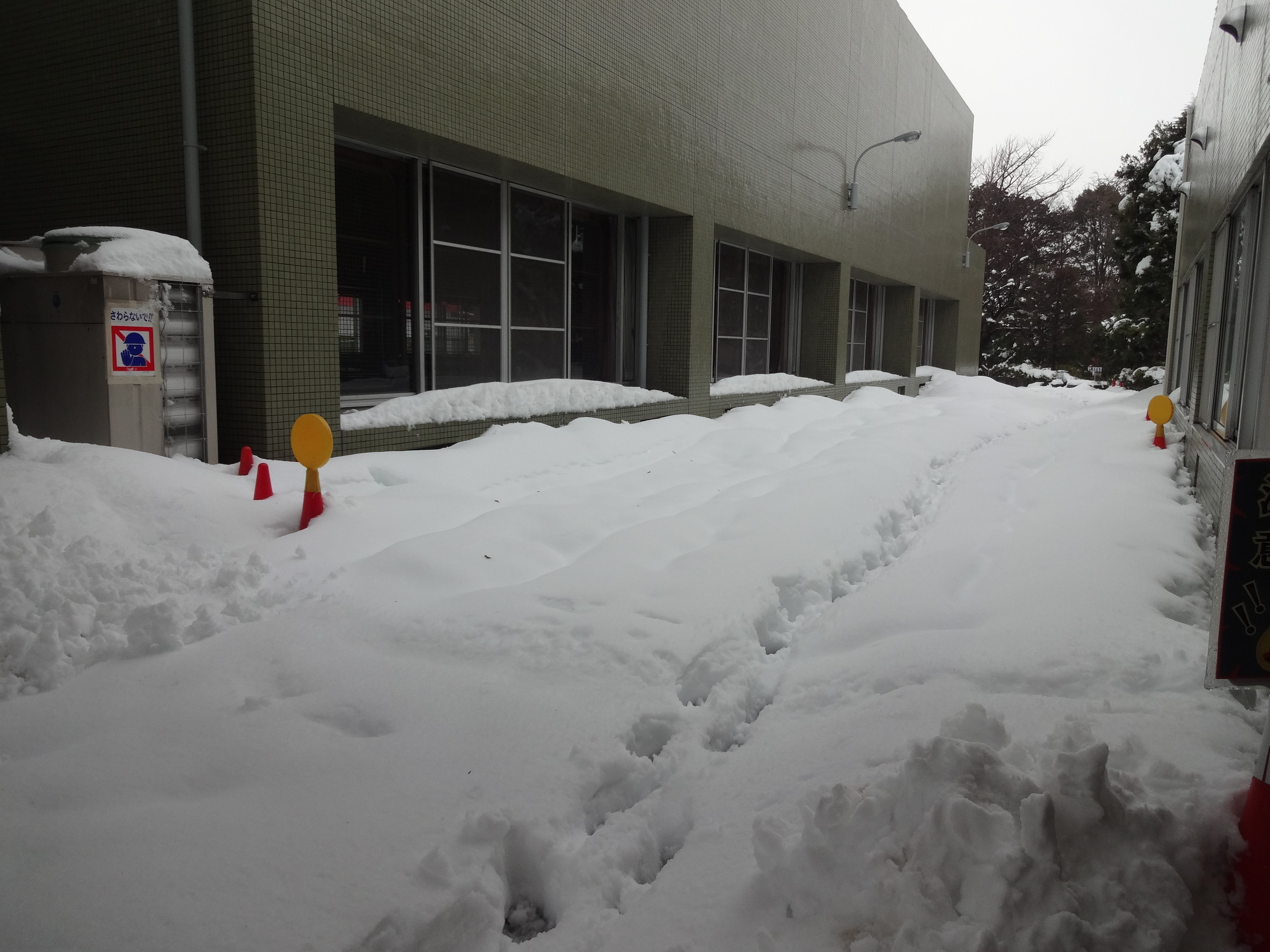 カラーコーンが埋まる程の積雪です。館長が出勤してきた足跡。