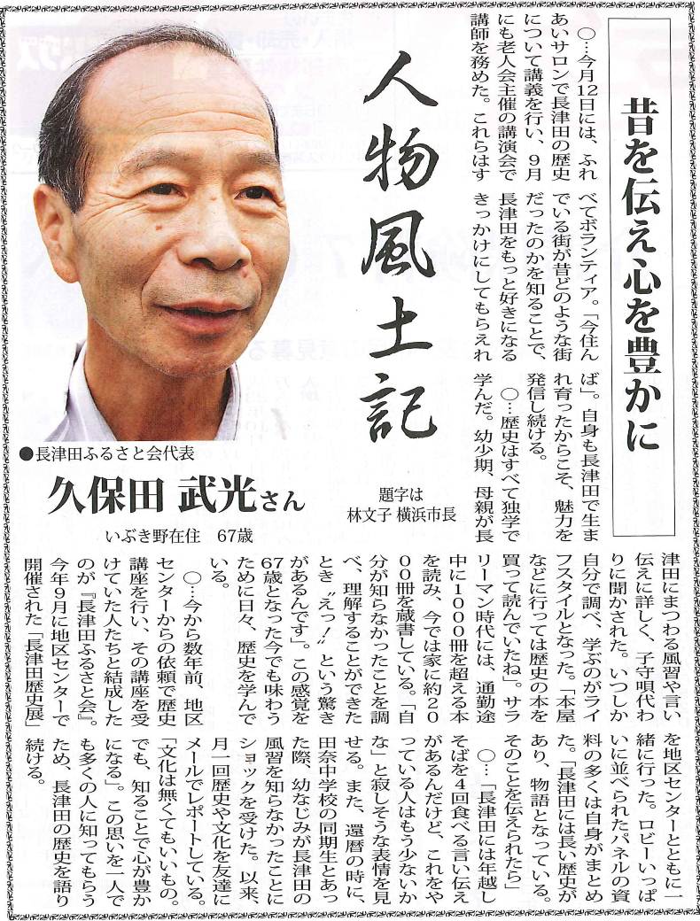 「長津田ふるさと会」代表の久保田武光さんが、タウンニュースにとりあげられました。