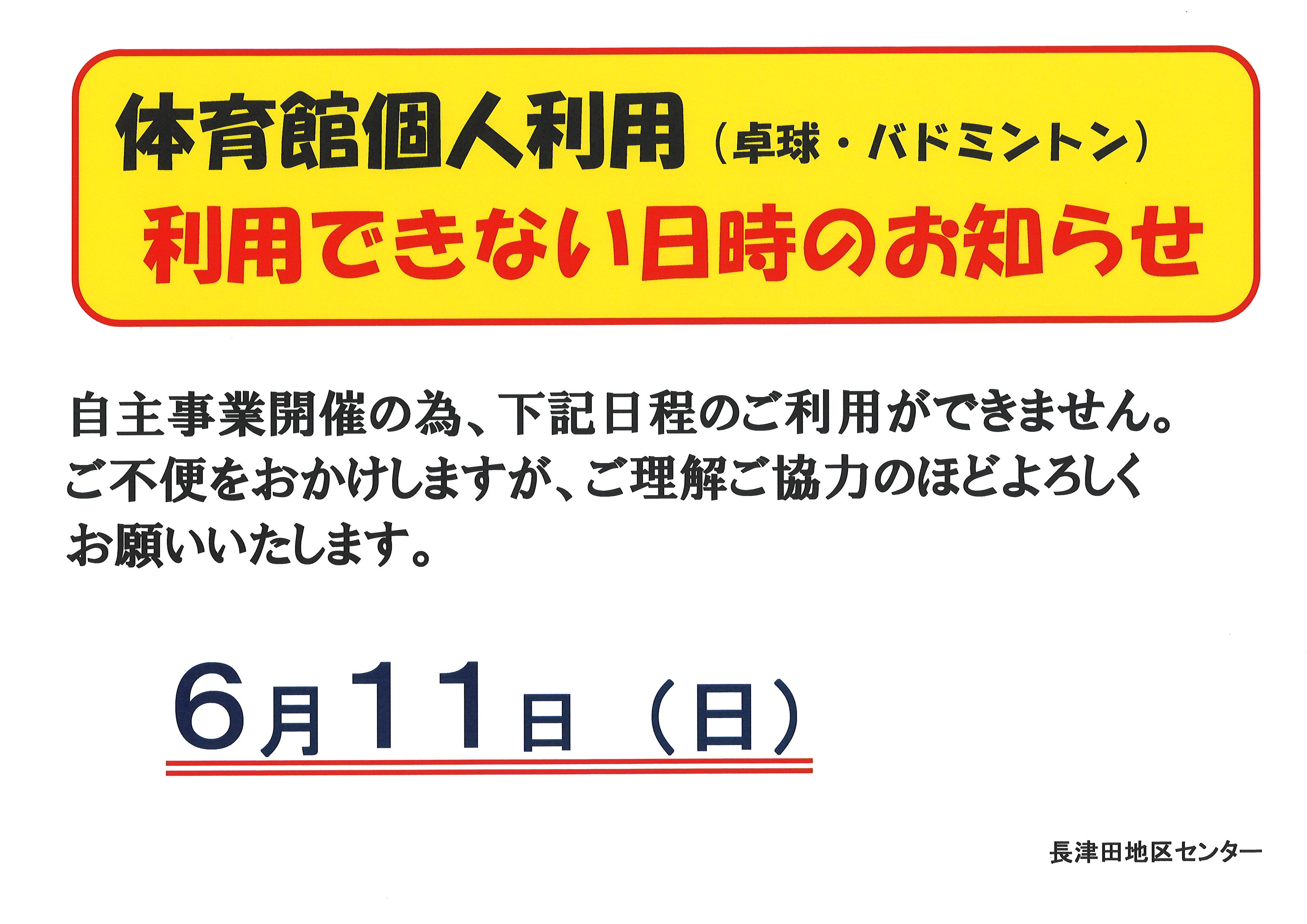 ◆体育館個人利用〔卓球・バドミントン〕ご利用出来ない日程のお知らせ