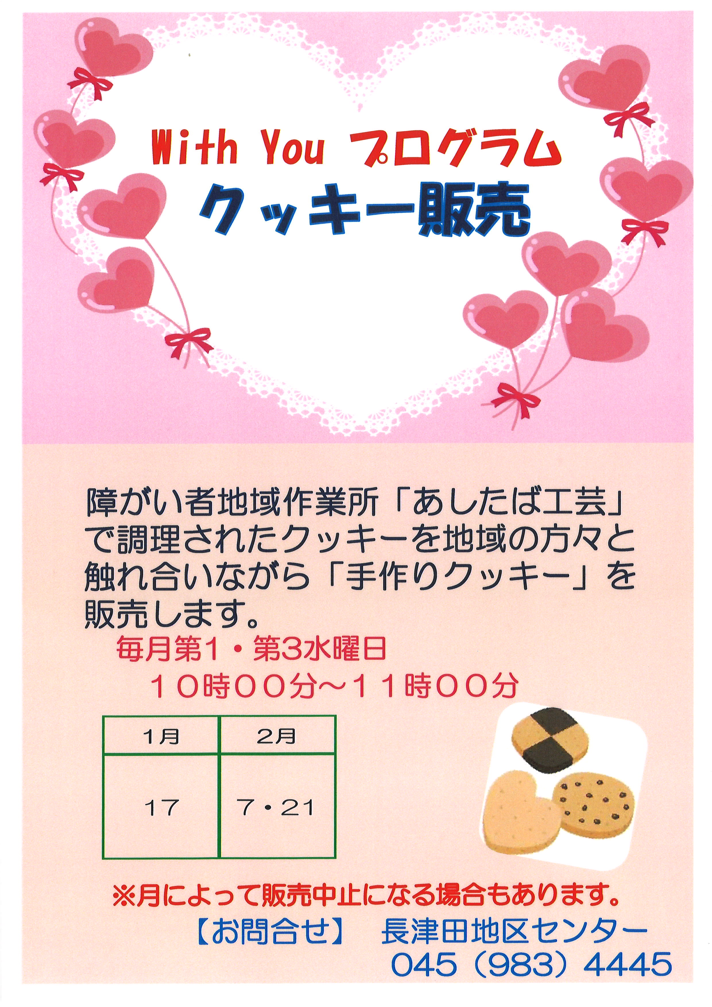 当館では with You プログラムとして、障がい者地域作業所「あしたば工芸」で調理されたクッキーを地域の方々と触れ合いながら「手作りクッキー」を販売しております。