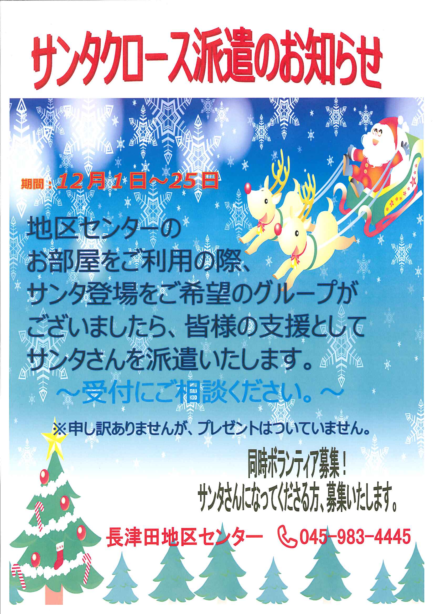 今年もクリスマスシーズンが到来します。長津田地区センターでは恒例となりつつあるサンタさんの派遣を今年も実施します。