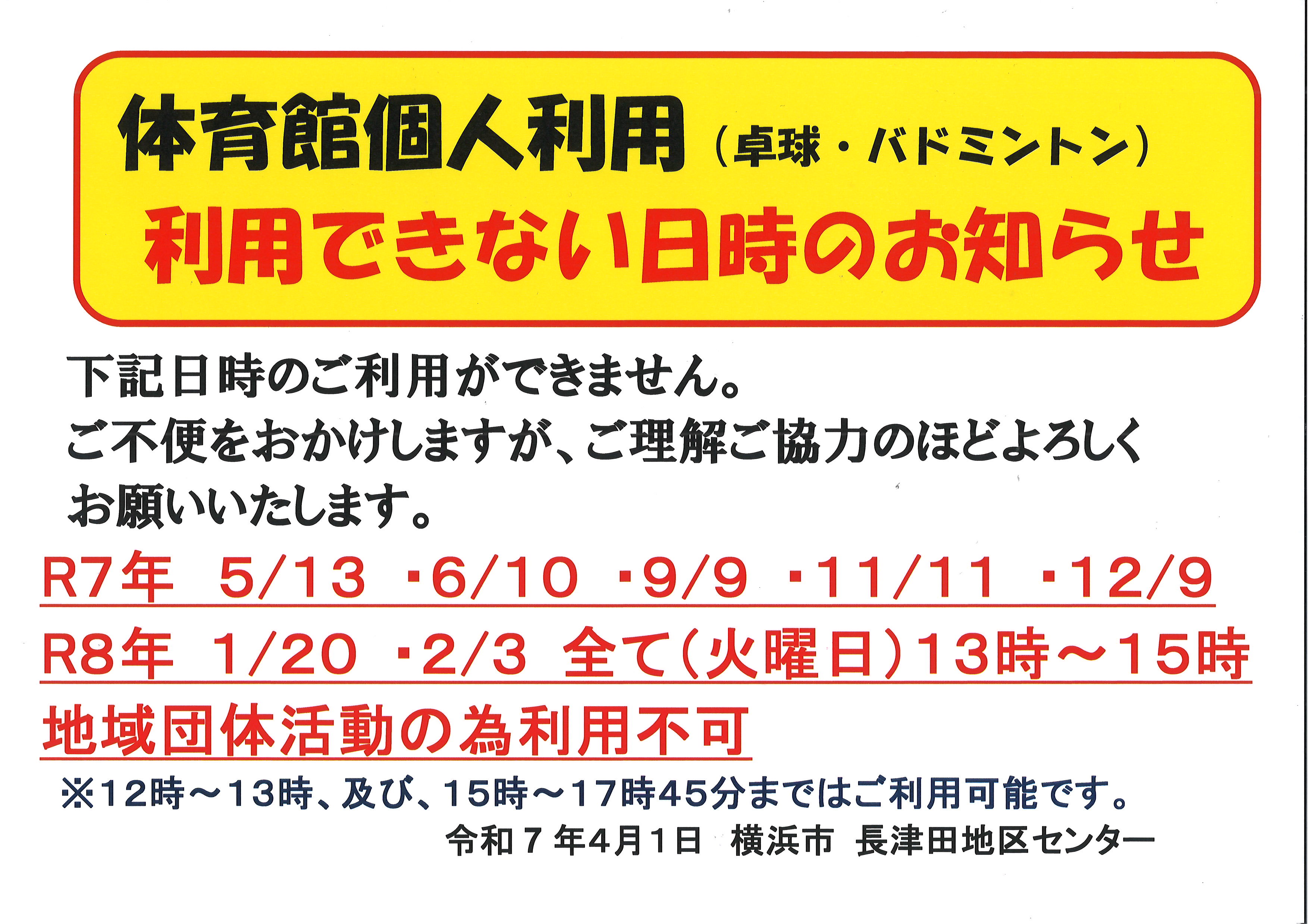 添付資料記載の日程は体育館個人利用〔卓球・バドミントン〕が出来ません。