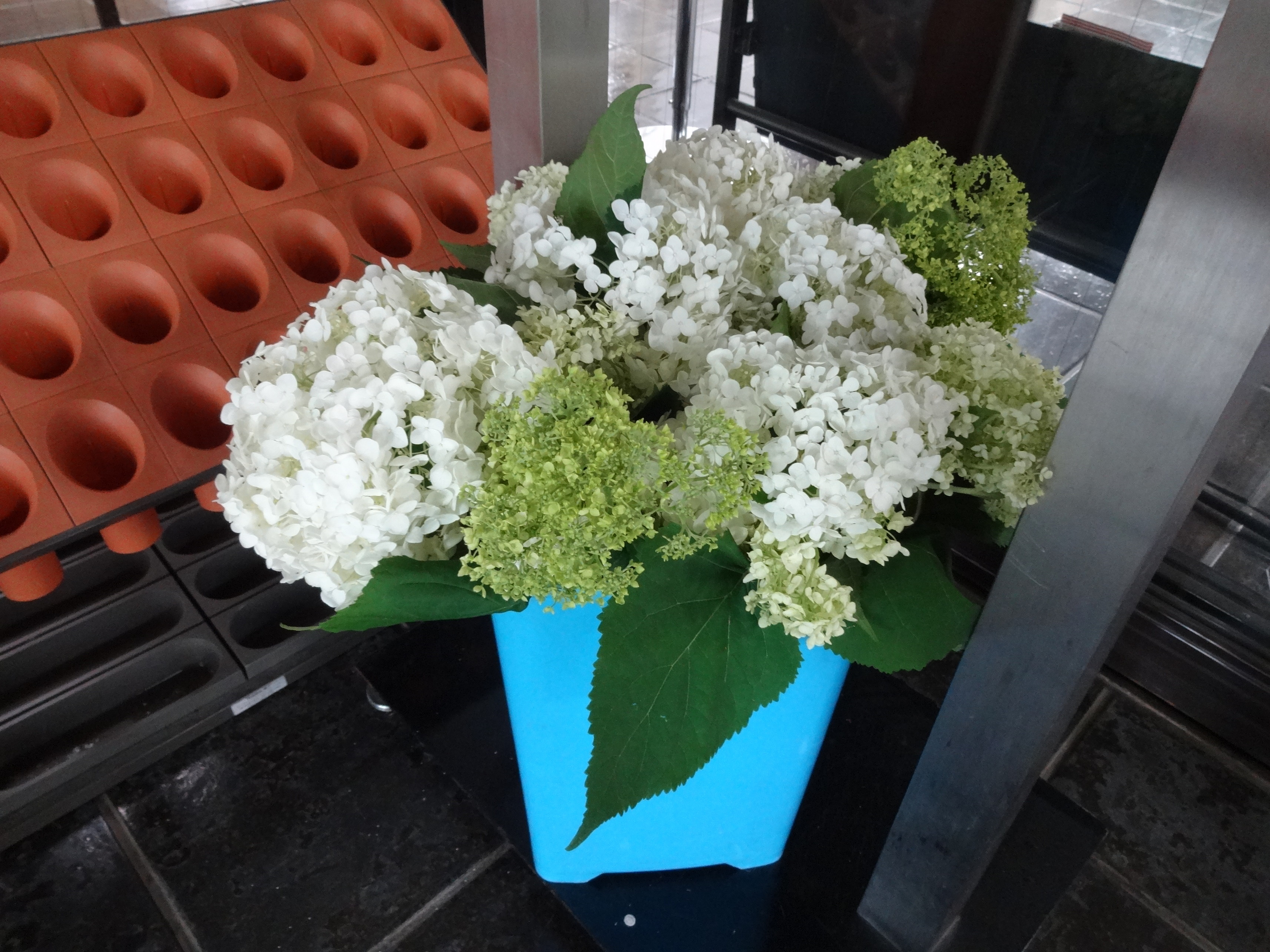 白の紫陽花が、本館玄関でご来場の皆さまをお迎えします。