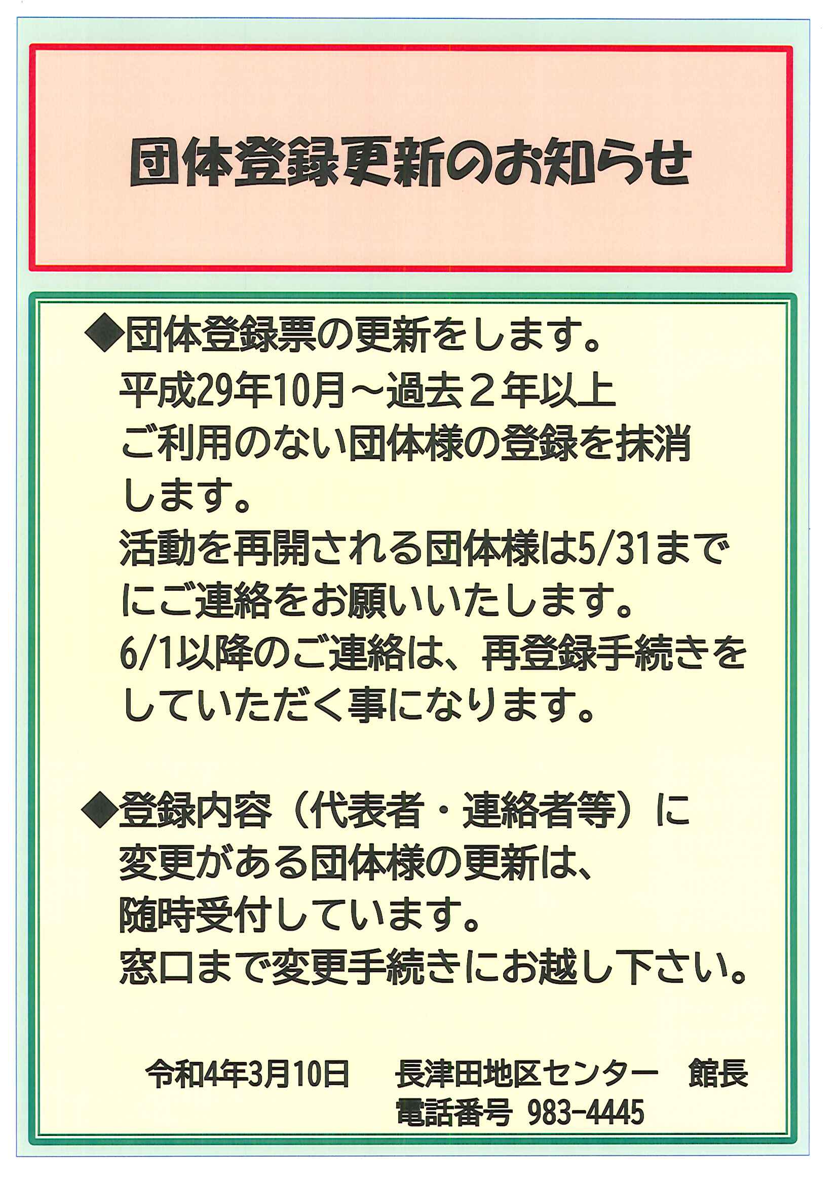 平素より長津田地区センターをご利用頂きまして誠にありがとうございます。