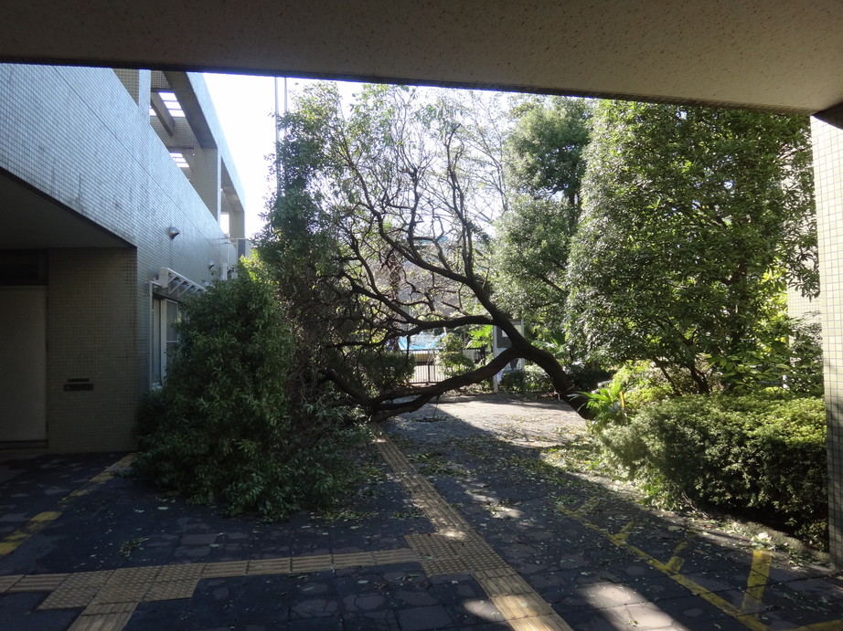 昨日の台風の影響により倒れた菊桃は、残念ながら根元の損傷がひどく、撤去をすることになりました。