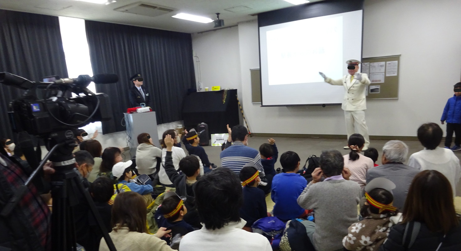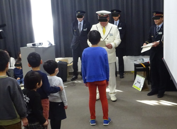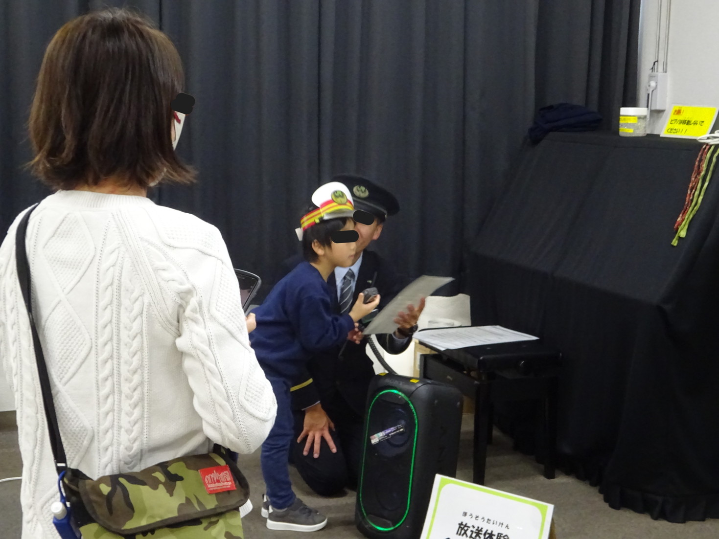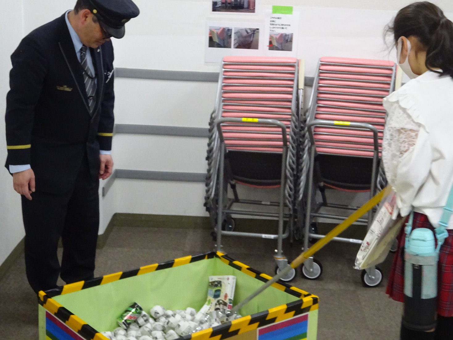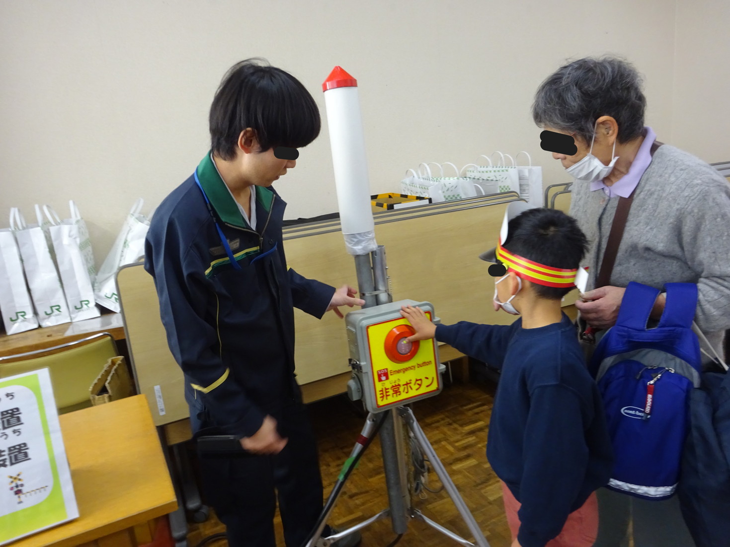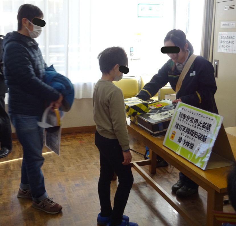 駅のお仕事セミナー&クイズ大会、体験コーナーでは ①『駅長制服撮影会』、②『駅の非常停止ボタン疑似体験』、③『駅員さんが使っているもの紹介』マジックハンド・起床装置、④『車掌さんの放送体験』など、様々な体験をして頂きました。
