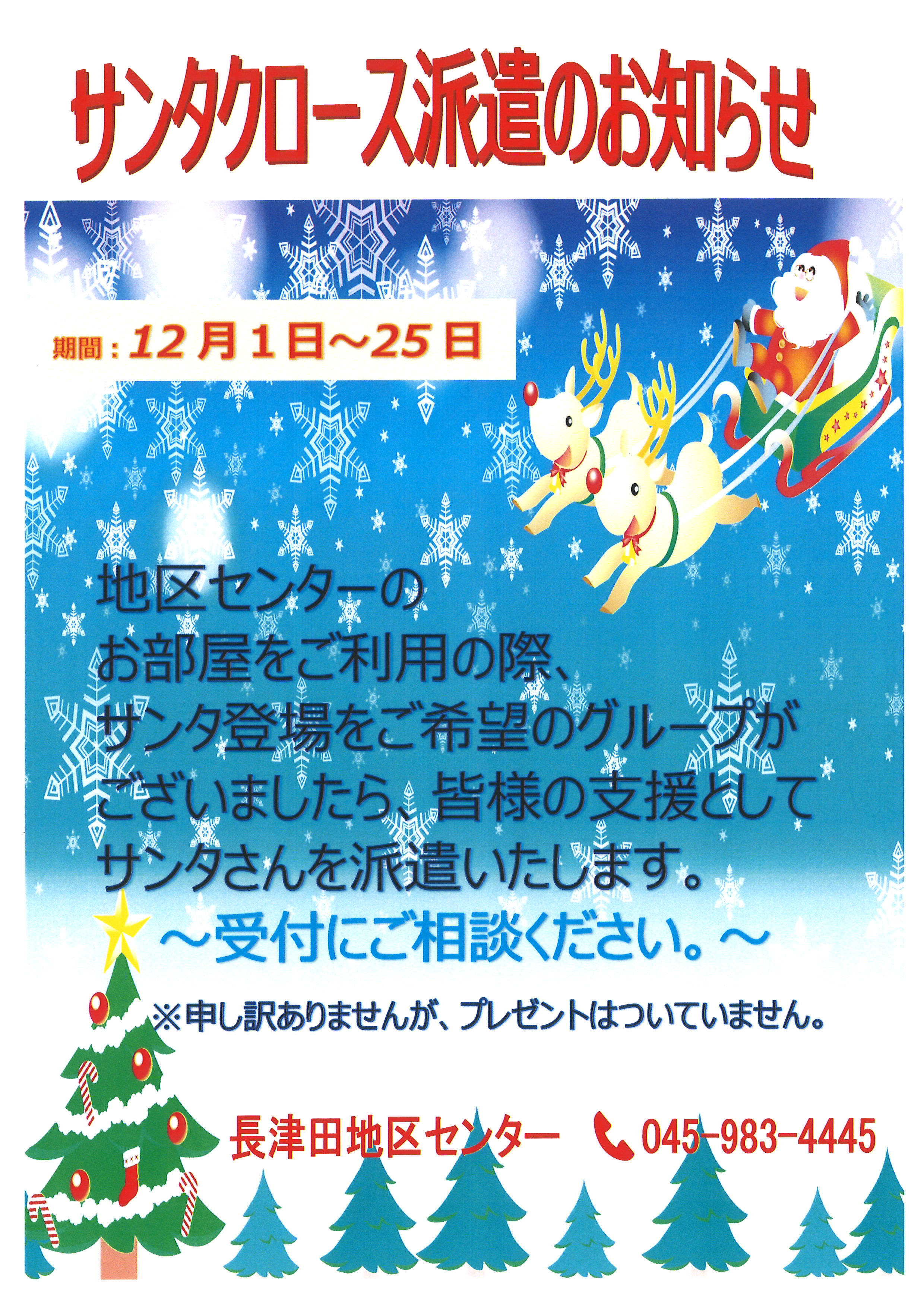 地区センターのお部屋をご利用の際、サンタさん登場をご希望のグループがございましたら、皆様の活動支援としてサンタさんを派遣致します。