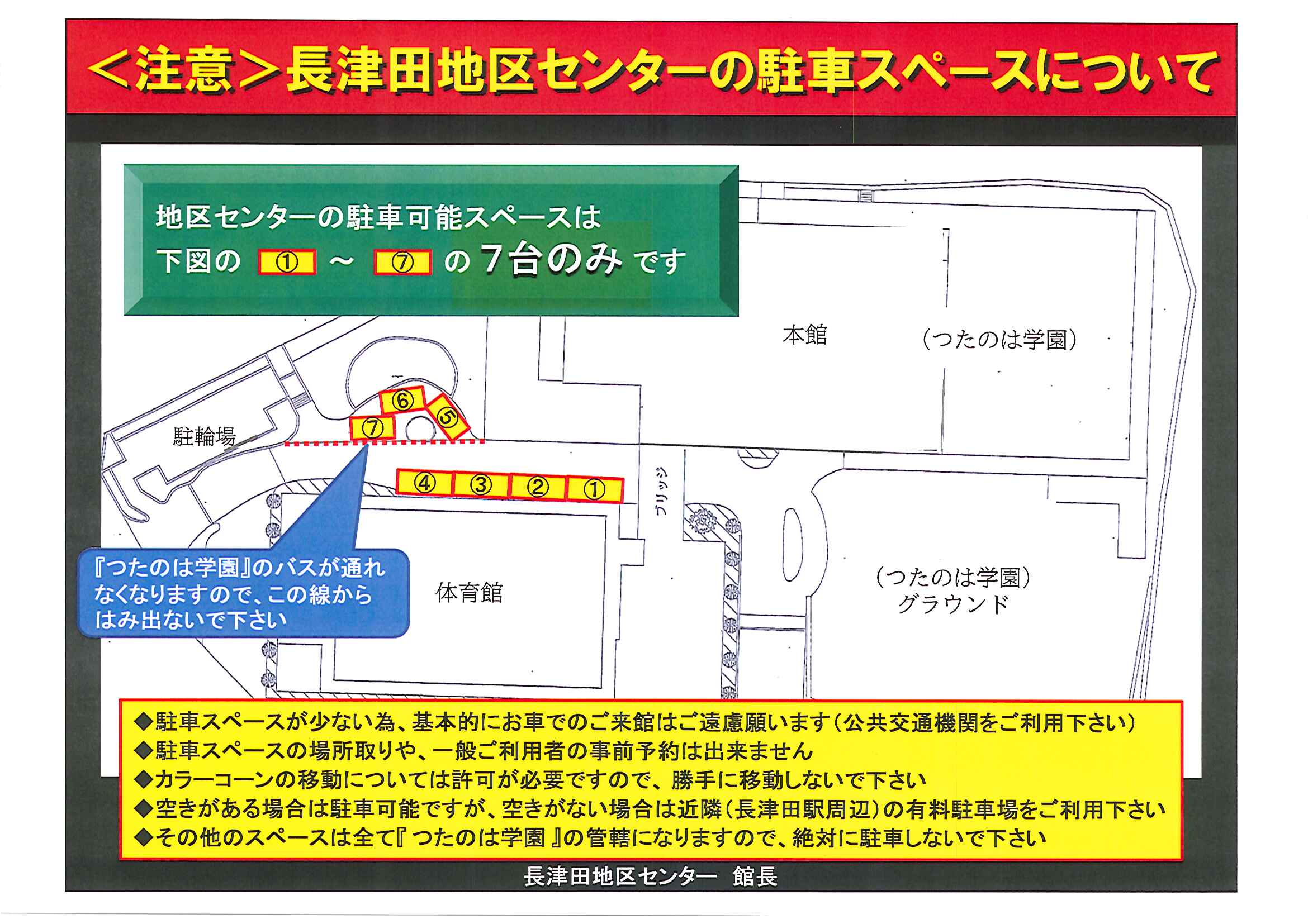以前より本館入口、及び、体育室内にも掲示してありますが、下記掲示内容を再度ご確認頂き、止むを得ず車両で来られた際に当館の駐車スペースが空いていなかった場合は絶対に違法駐車をせず、長津田駅周辺の有料駐車場等へ移動・駐車頂けます様お願い致します。