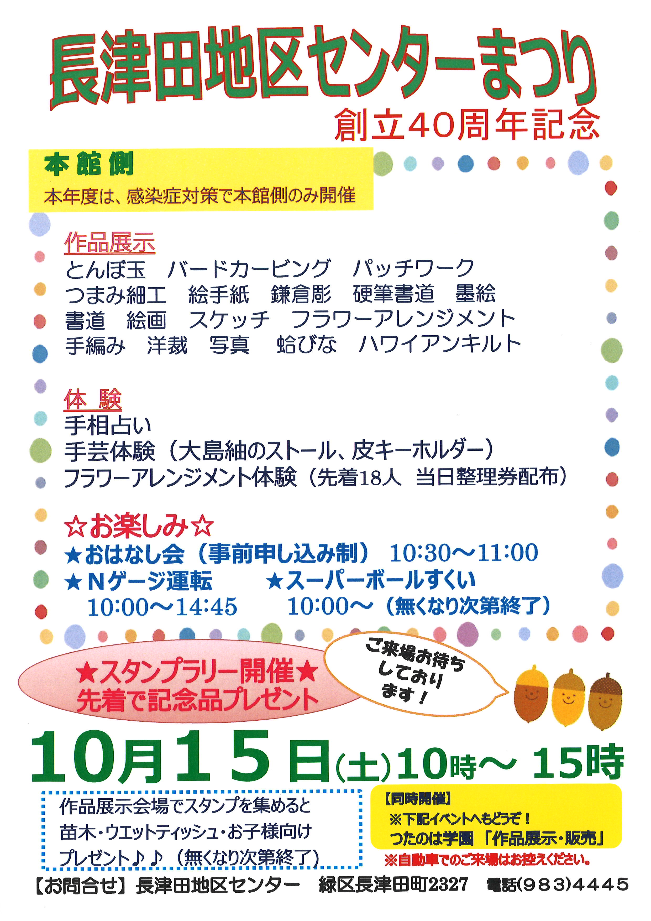 ここ数年の間、開催を自粛しておりました『長津田地区センターまつり』を本年度は感染症対策を徹底した上で規模を縮小し、開催させて頂くことと致しました。開催日時は下記の通りです。