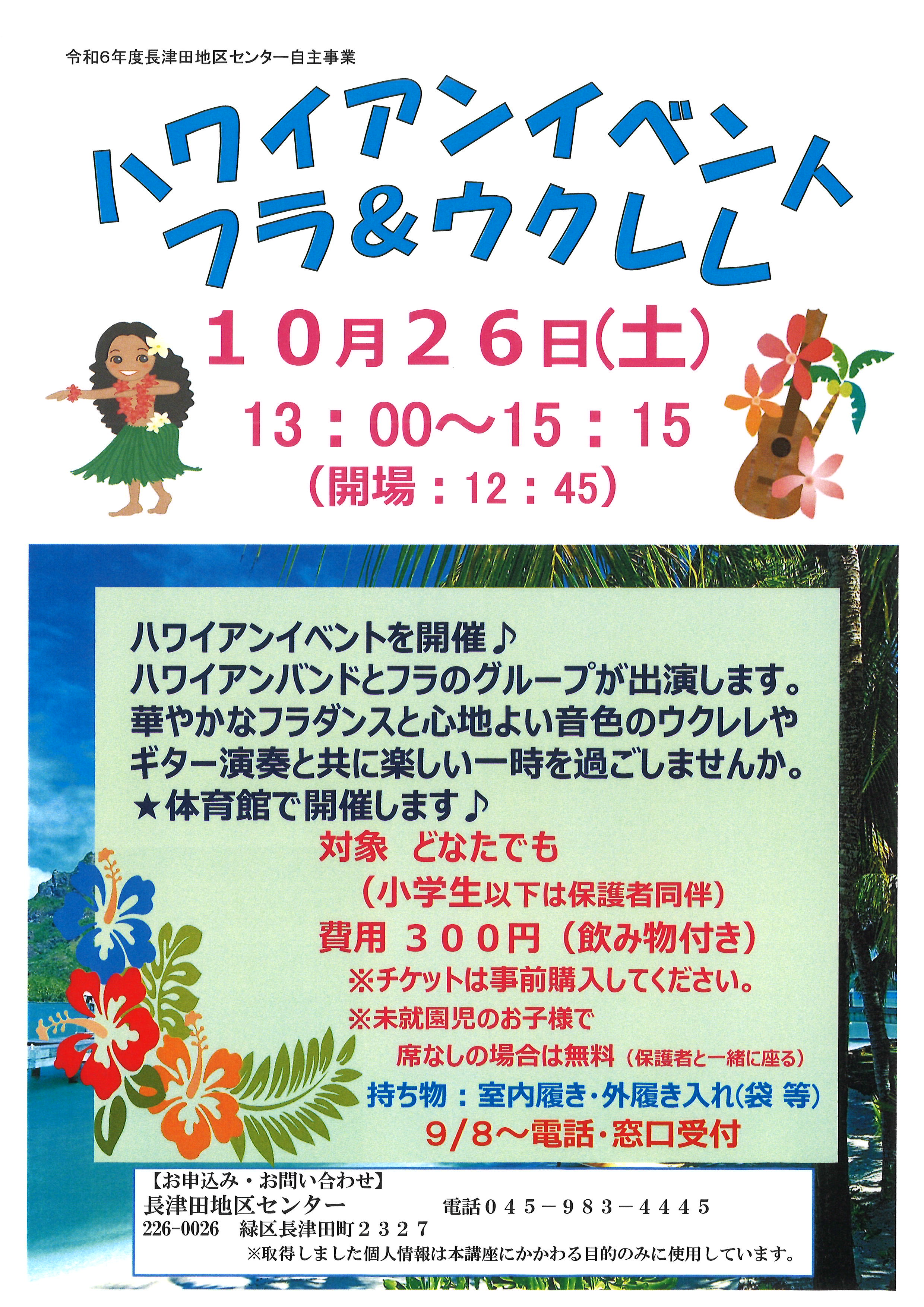 令和6年度も「ハワイアンイベント フラ&ウクレレ」を下記日時で開催致します。