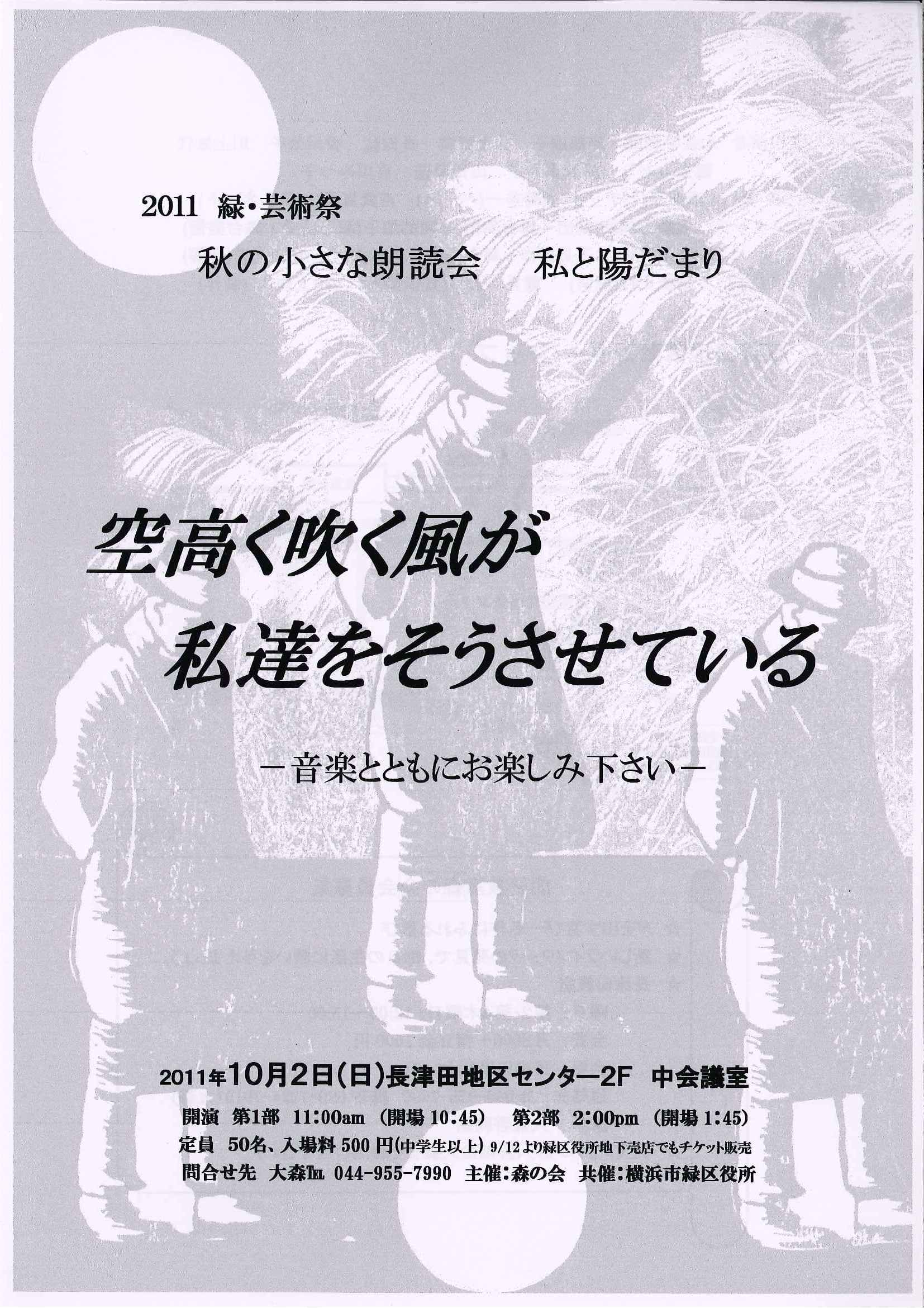 2011 緑・芸術祭 参加作品「秋の小さな朗読会~空高く吹く風が私達をそうさせている~」が、当長津田地区センターを会場として、公演されます。