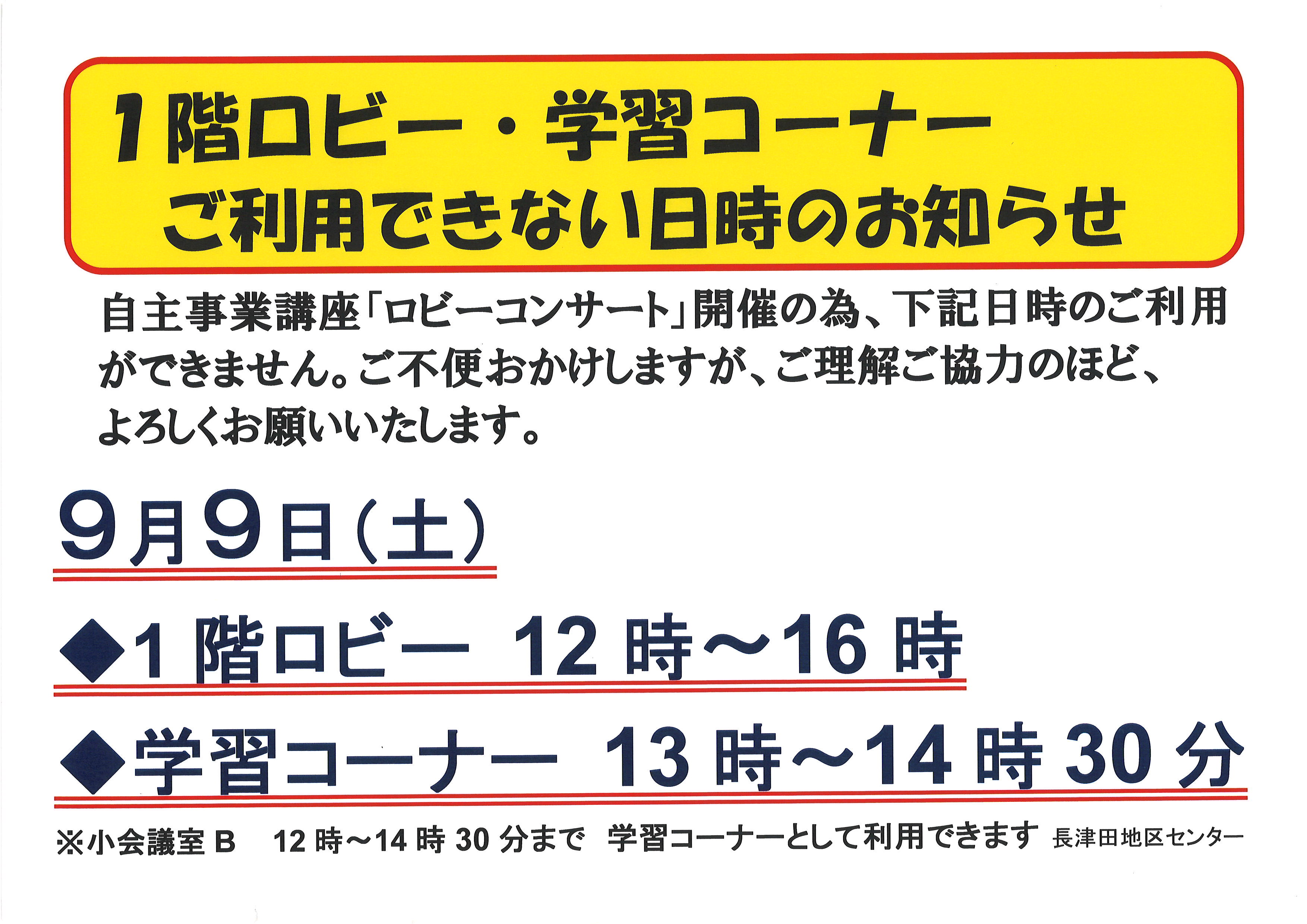 9月9日(土)自主事業講座「ロビーコンサート」開催の為、添付内容の時間帯でご利用ができません。