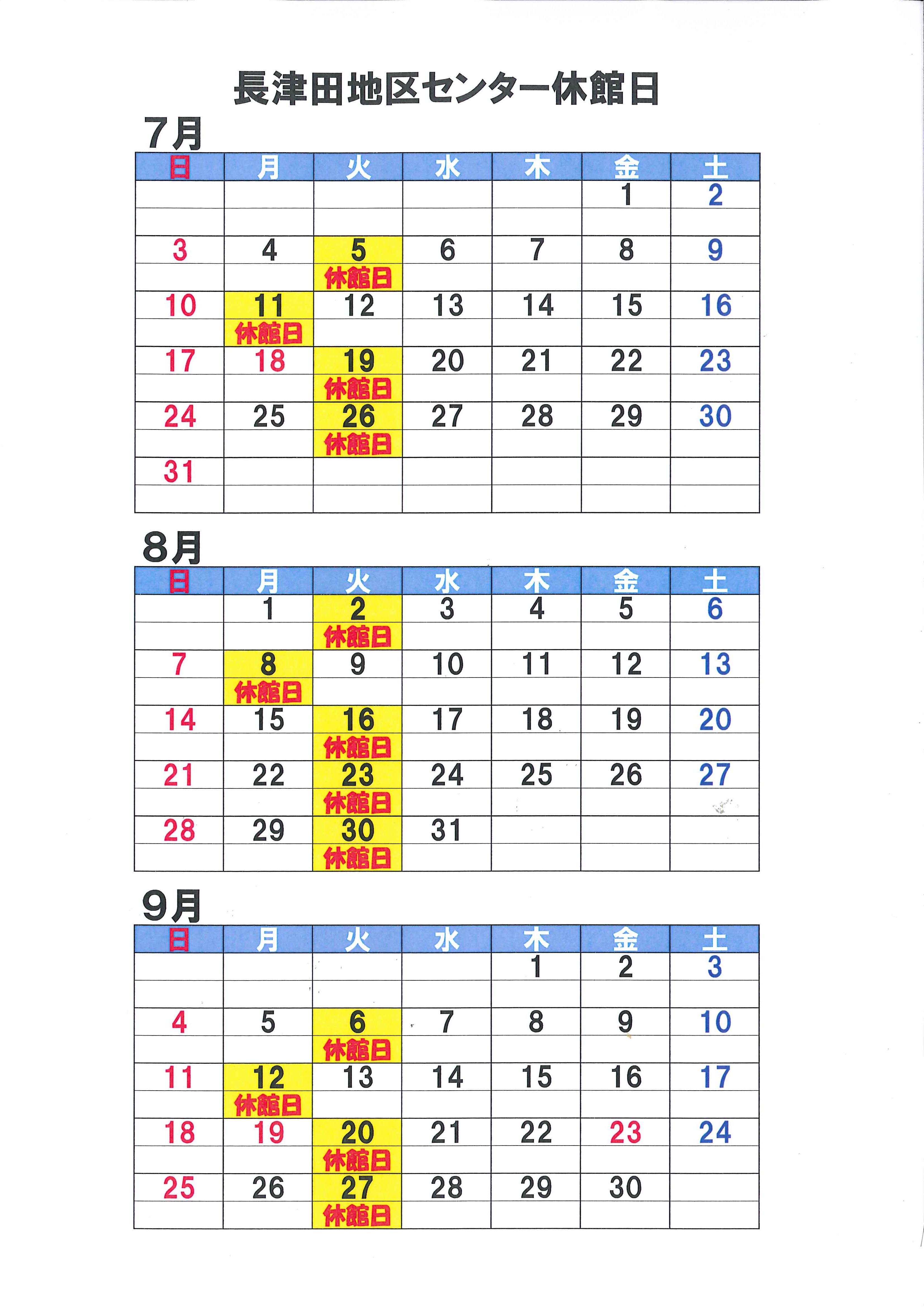 7月の休館日 8月の休館日 9月の休館日