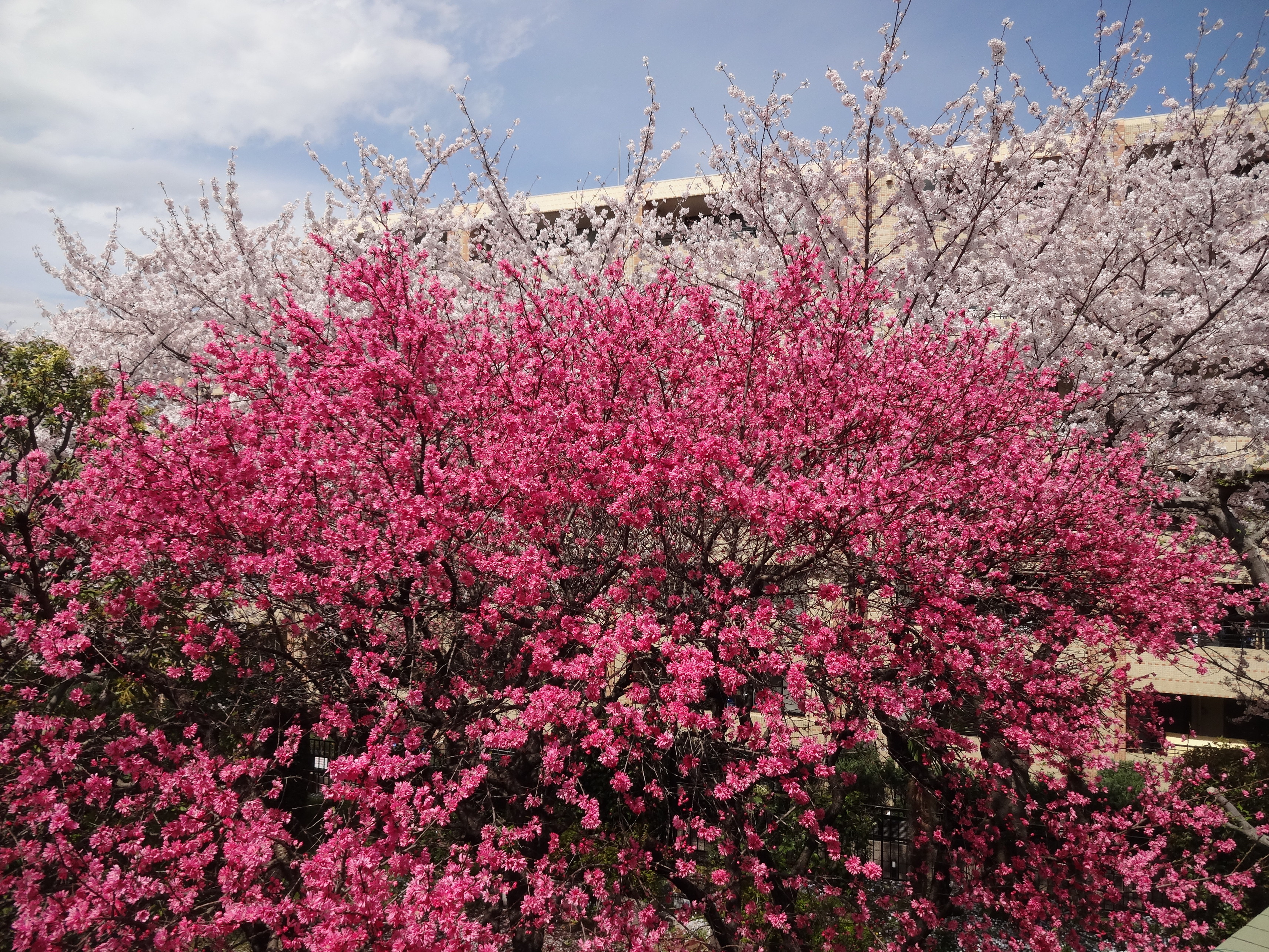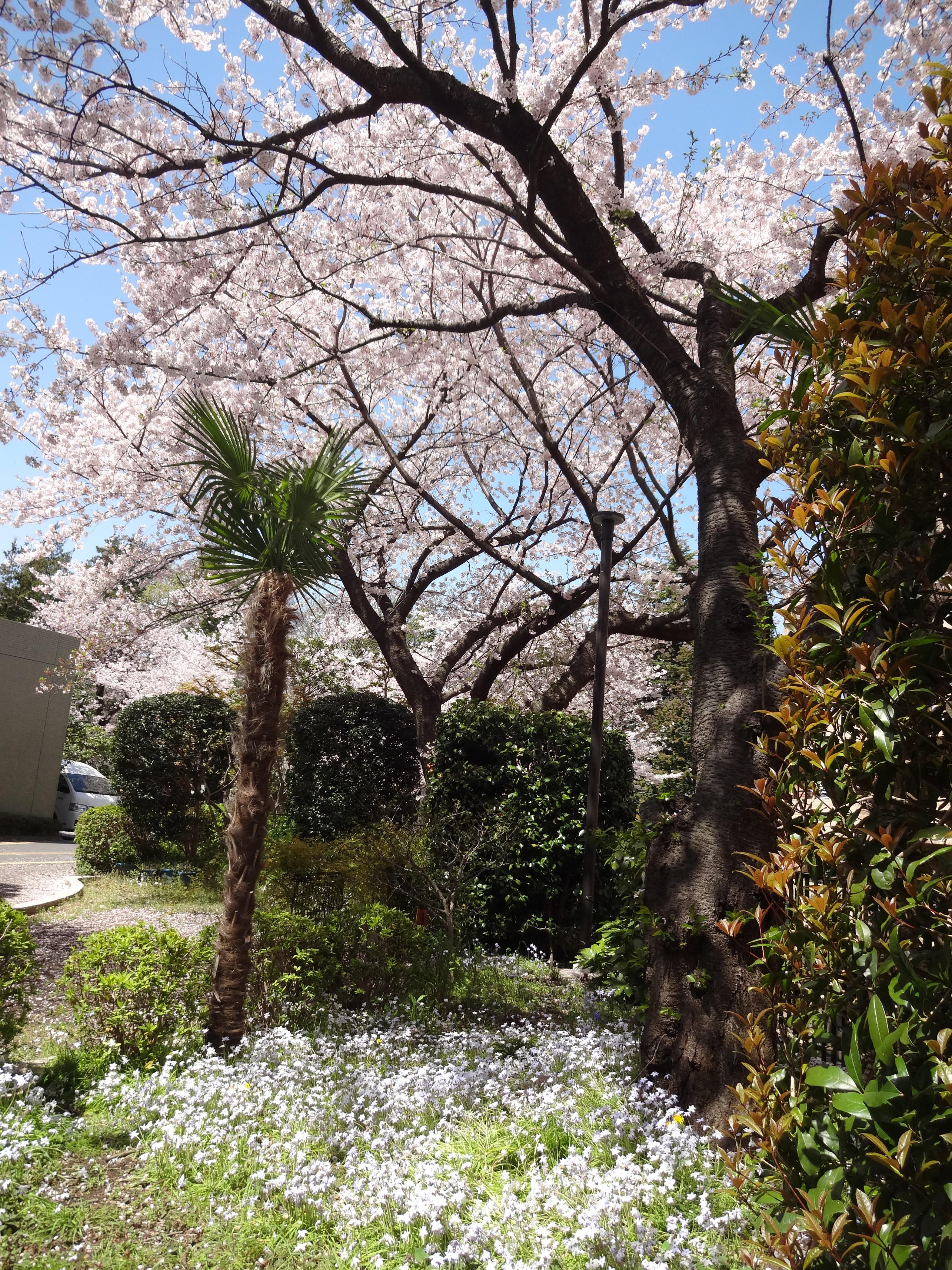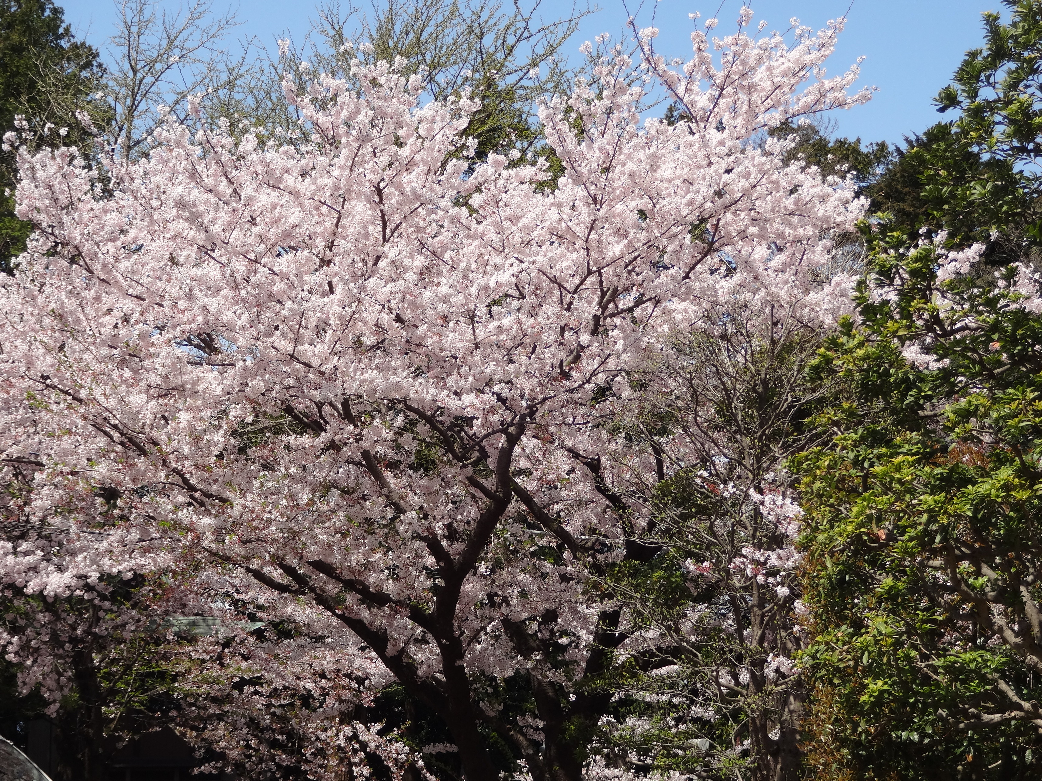 地区センターの桜は満開で春の太陽を受け、花びら1枚1枚が輝きを放ち
