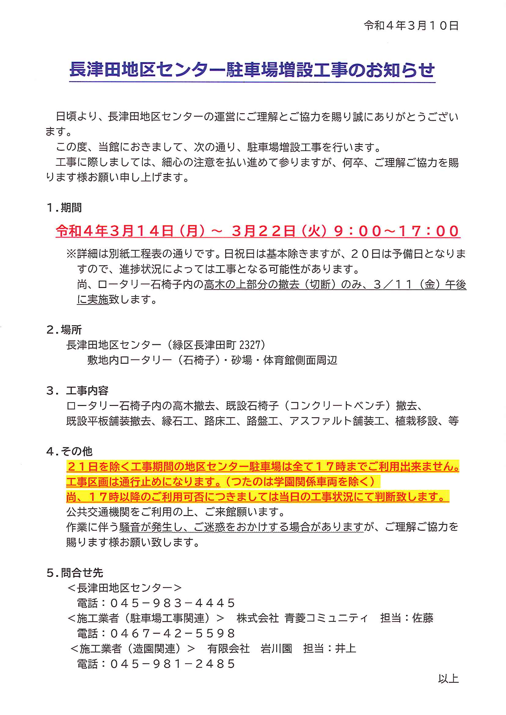 日頃より、長津田地区センターをご利用頂きまして誠にありがとうございます。この度、当館におきまして、次の通り、駐車場増設工事を行います。