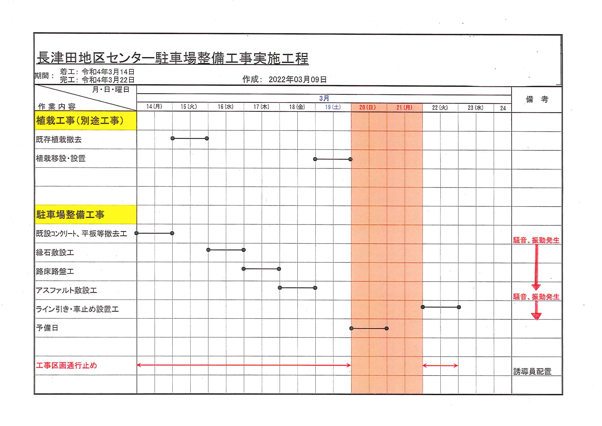 ※詳細は別紙工程表の通りです。日祝日は基本除きますが、20日は予備日となりますので、進捗状況によっては工事となる可能性があります。